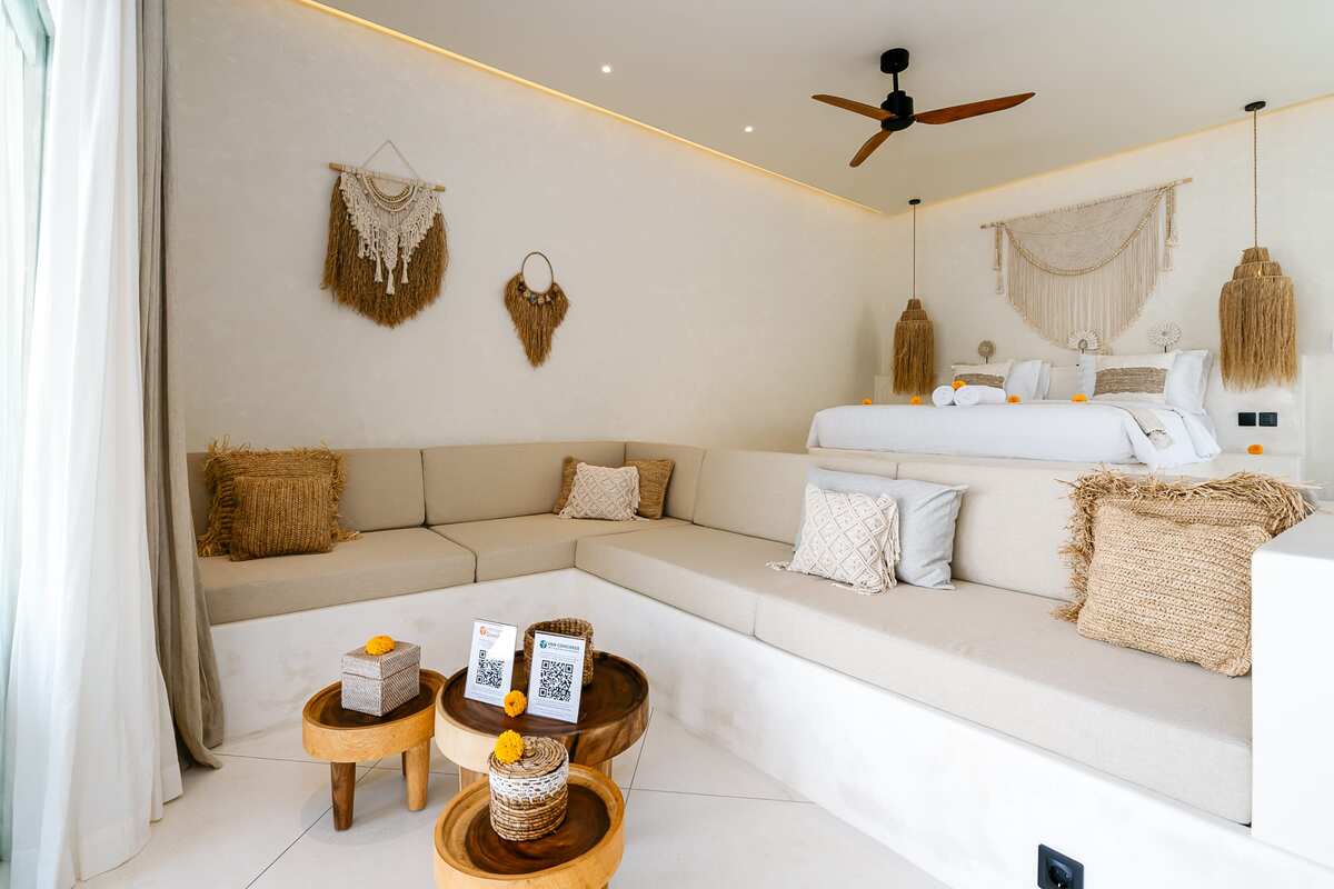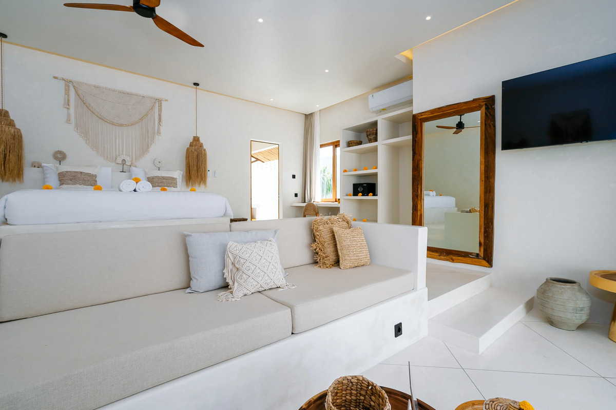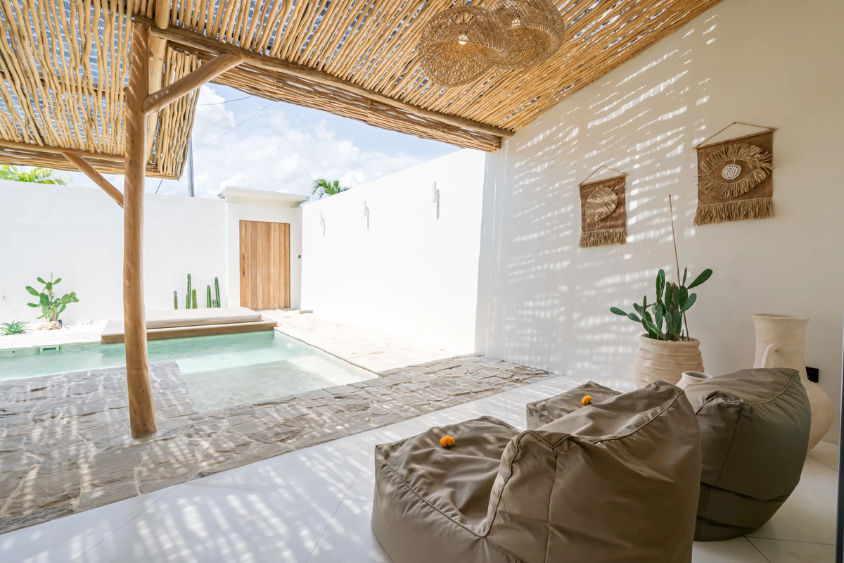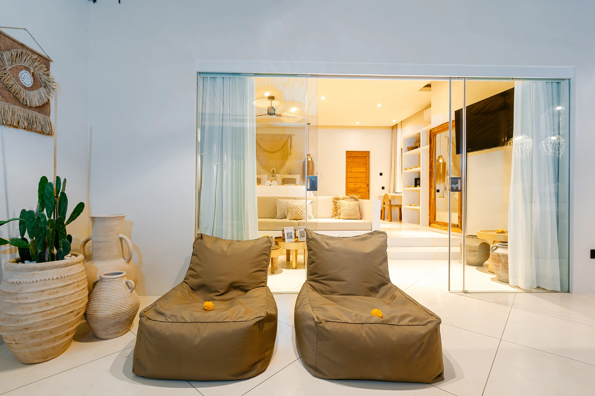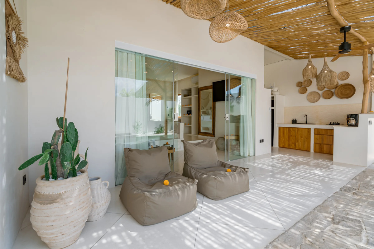 Villa Papaz is a brand-new, stylish villa perfect for couples or solo travelers. It features a spacious bedroom with a king-size bed, ensuite bathroom, work desk, and smart TV. The open-air living area includes a fully equipped kitchenette and flows seamlessly to the pool. Located in Seseh, it’s just a short walk to the beach and right next to the trendy Luna Beach Club.