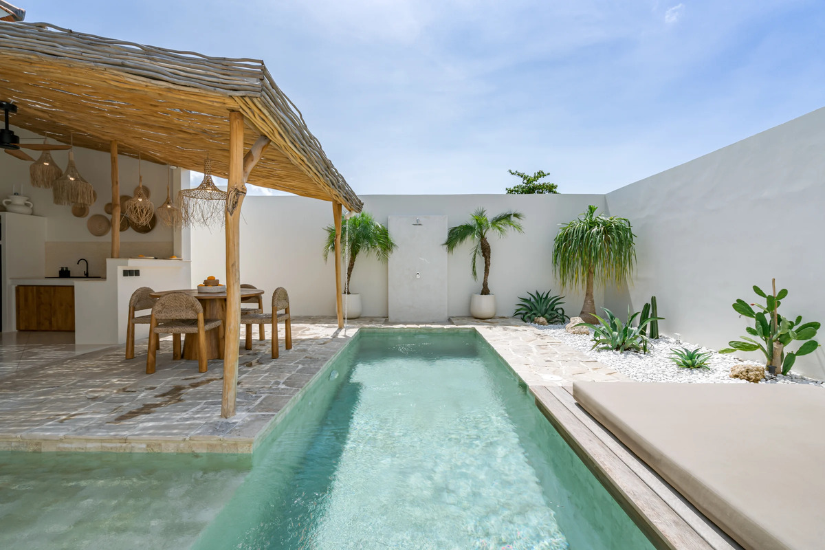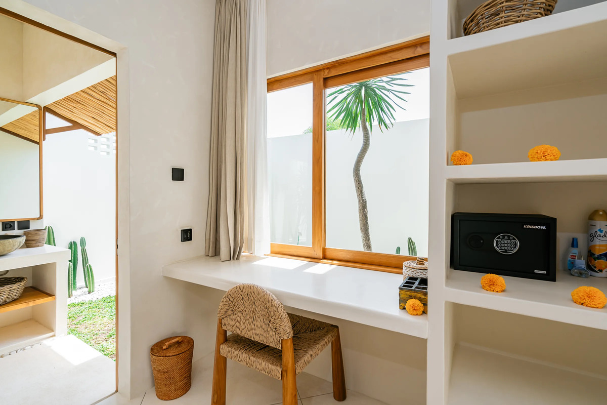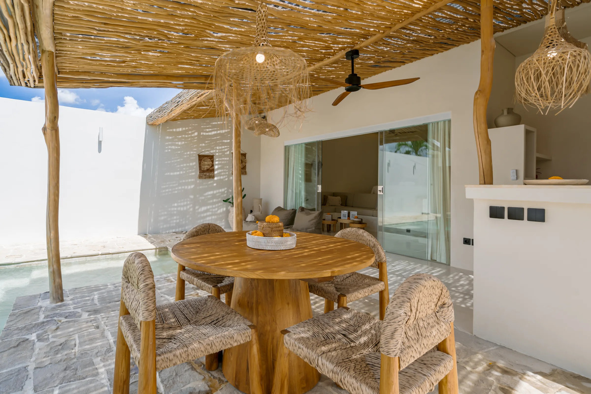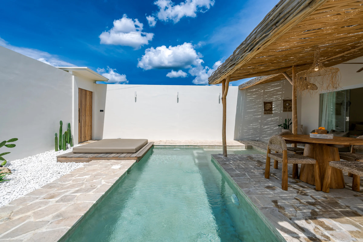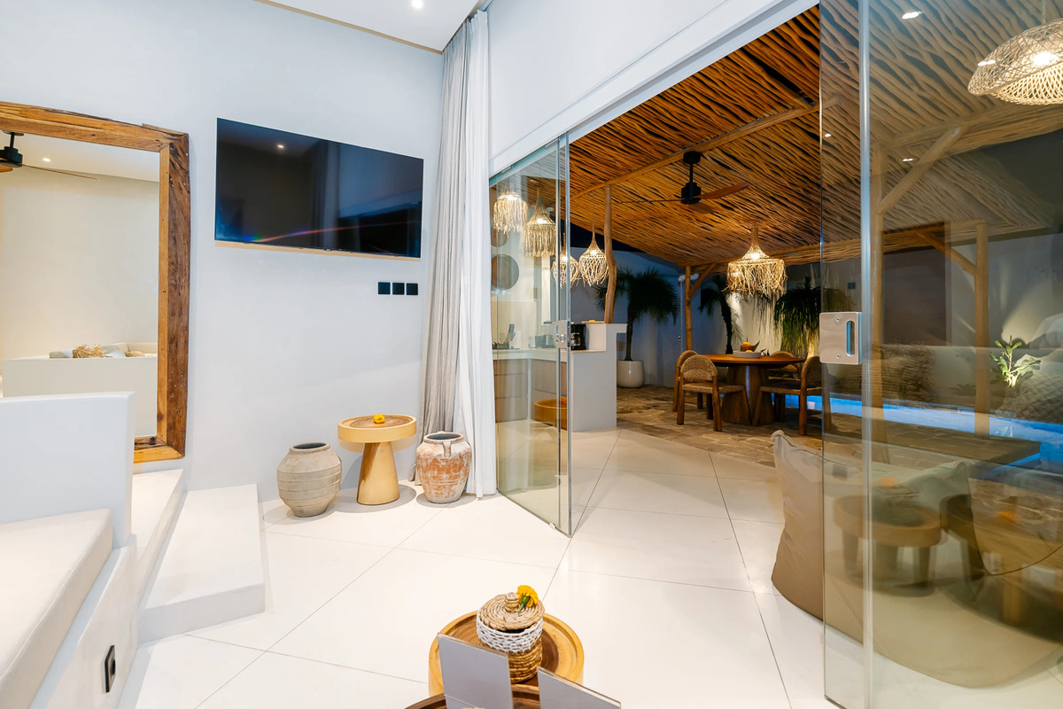 Villa Papaz is a brand-new, stylish villa perfect for couples or solo travelers. It features a spacious bedroom with a king-size bed, ensuite bathroom, work desk, and smart TV. The open-air living area includes a fully equipped kitchenette and flows seamlessly to the pool. Located in Seseh, it’s just a short walk to the beach and right next to the trendy Luna Beach Club.