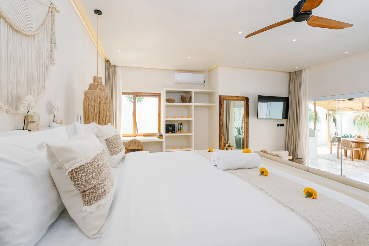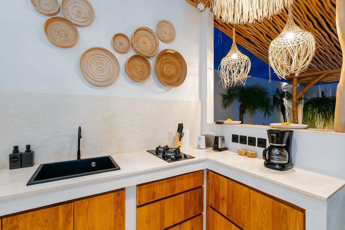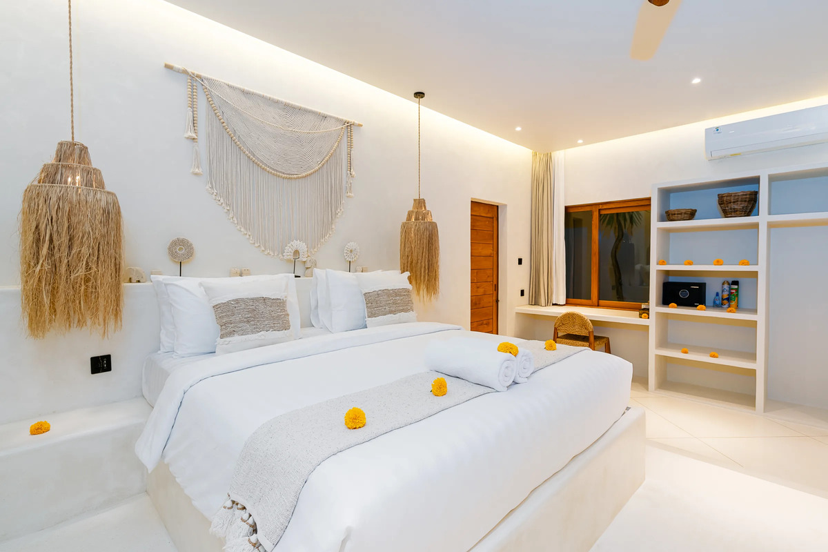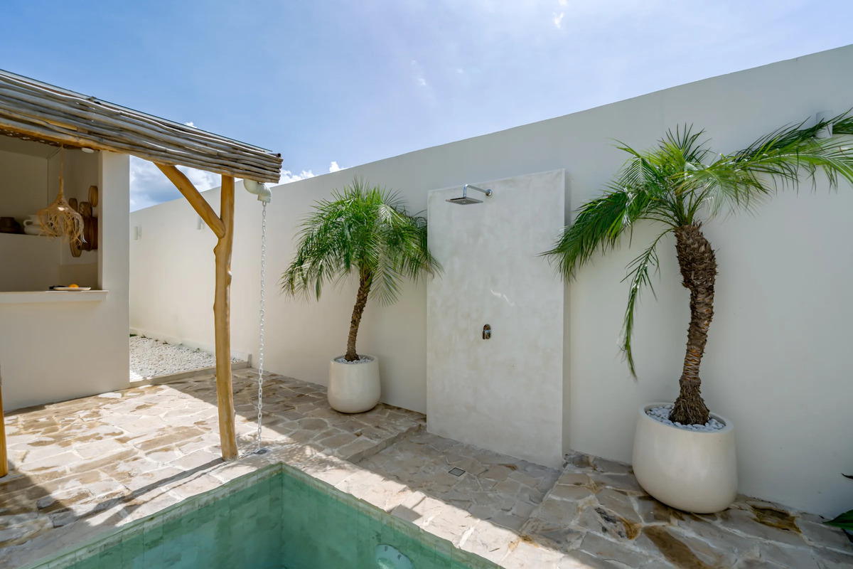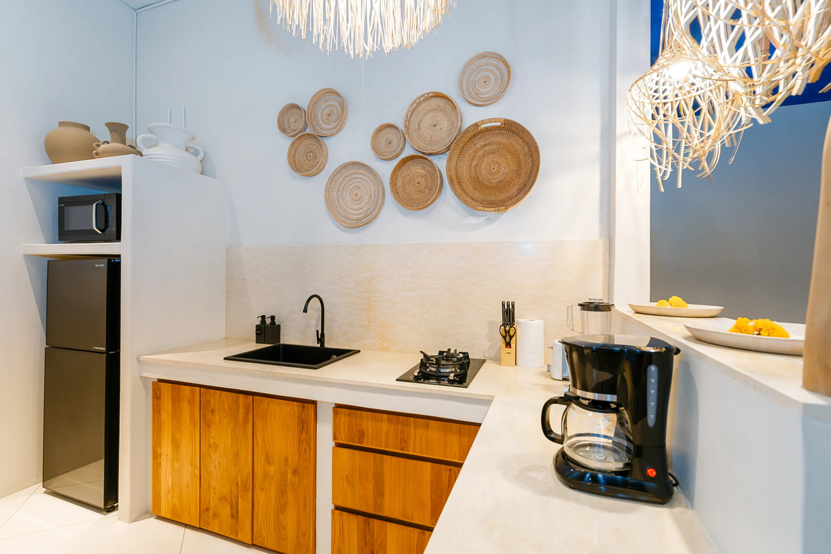 Villa Papaz is a brand-new, stylish villa perfect for couples or solo travelers. It features a spacious bedroom with a king-size bed, ensuite bathroom, work desk, and smart TV. The open-air living area includes a fully equipped kitchenette and flows seamlessly to the pool. Located in Seseh, it’s just a short walk to the beach and right next to the trendy Luna Beach Club.