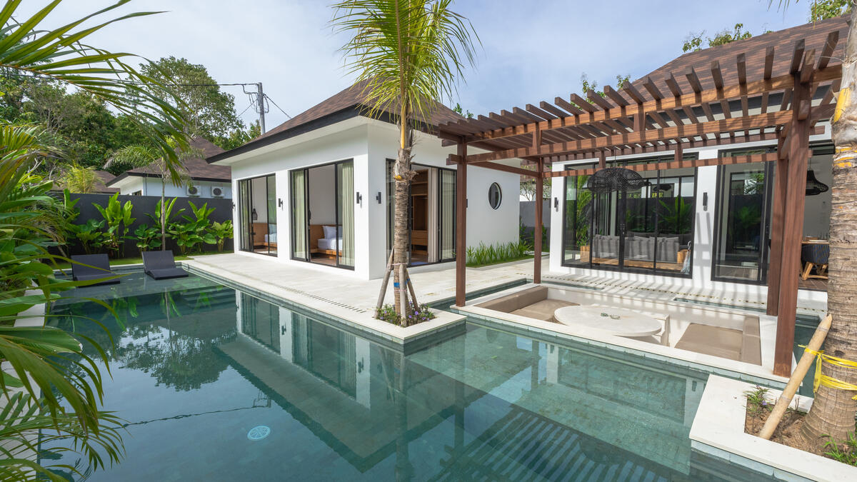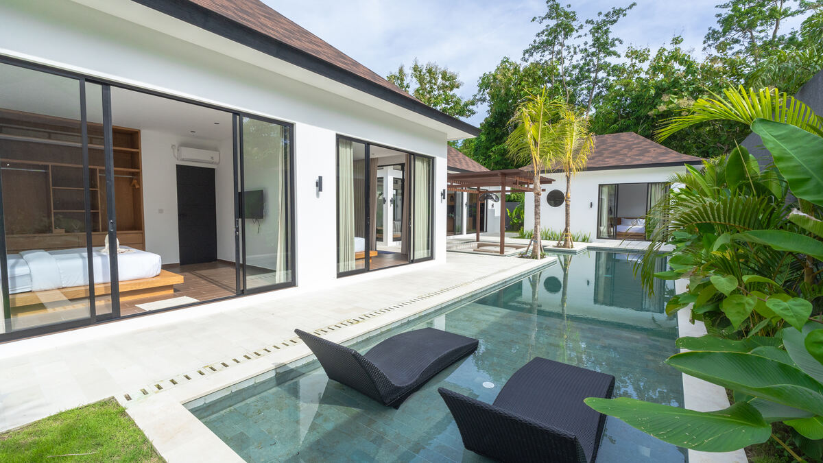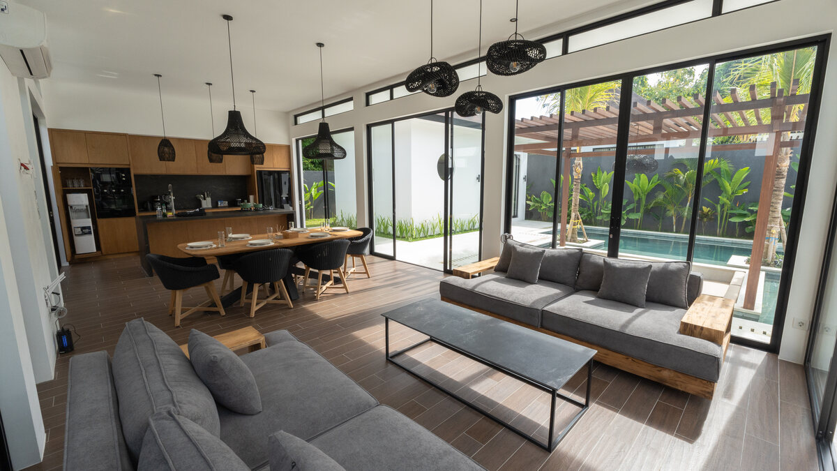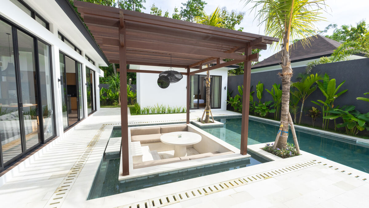 This elegant single-floor villa features three spacious bedrooms, each with its own bathroom, plus an additional guest bathroom for convenience. The open-concept living room and kitchen create a seamless indoor-outdoor flow, leading to a private pool with a stylish sunken lounge—perfect for relaxation and entertaining in a serene tropical setting.