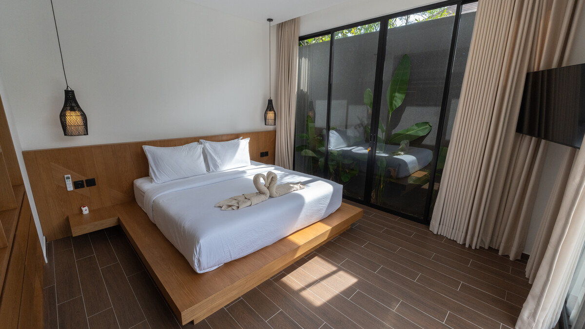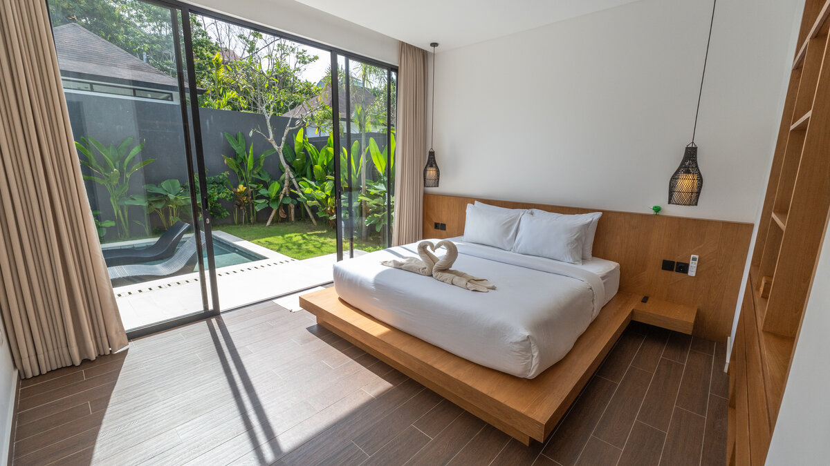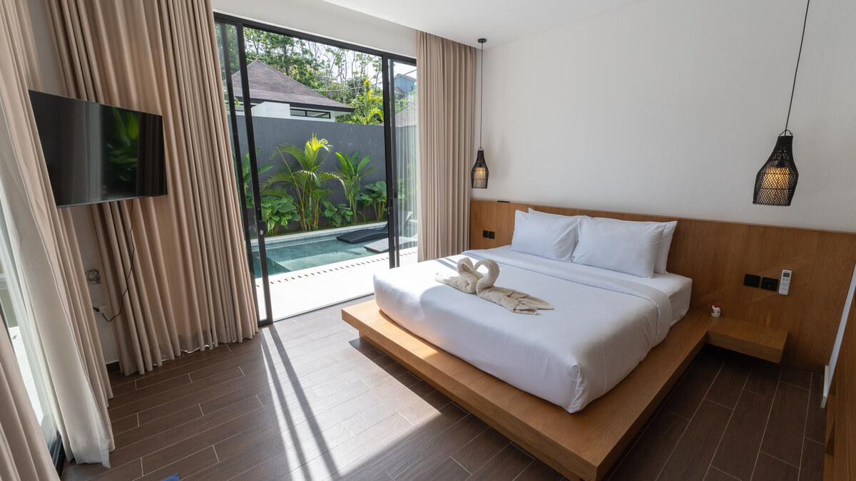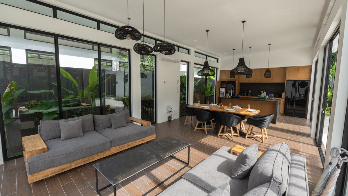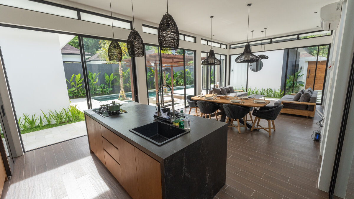 This elegant single-floor villa features three spacious bedrooms, each with its own bathroom, plus an additional guest bathroom for convenience. The open-concept living room and kitchen create a seamless indoor-outdoor flow, leading to a private pool with a stylish sunken lounge—perfect for relaxation and entertaining in a serene tropical setting.