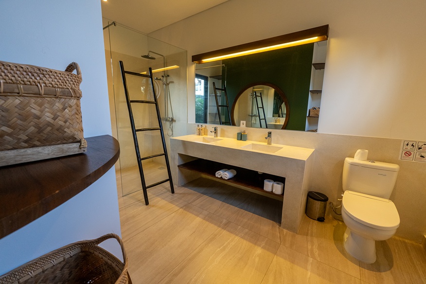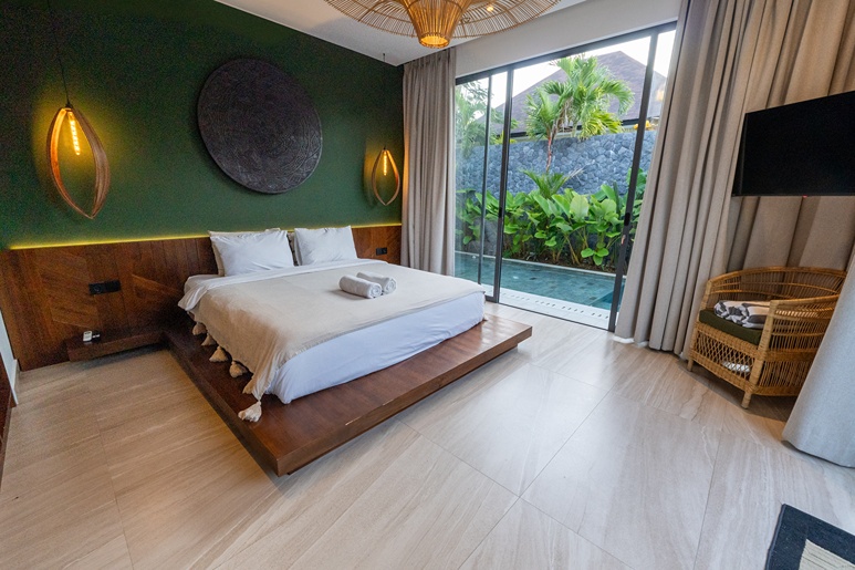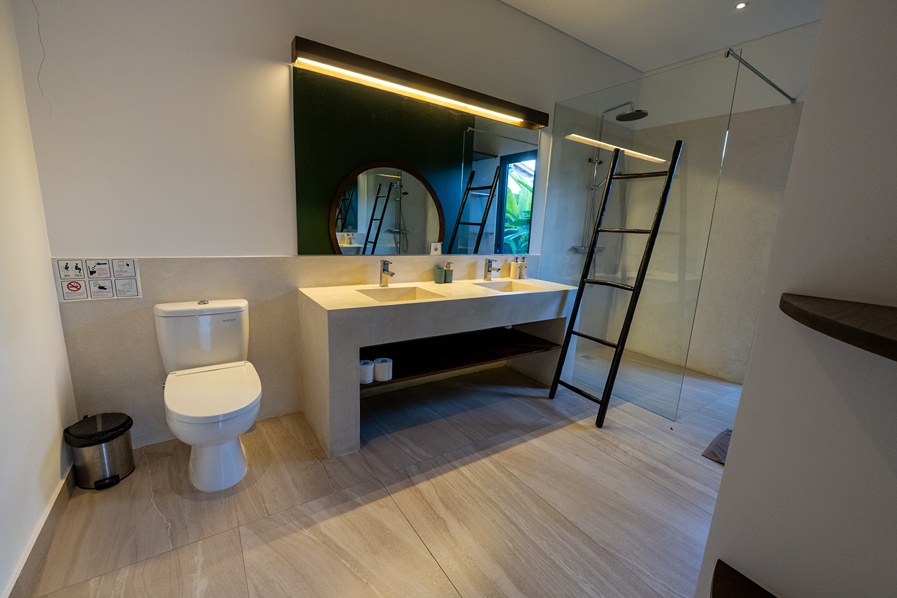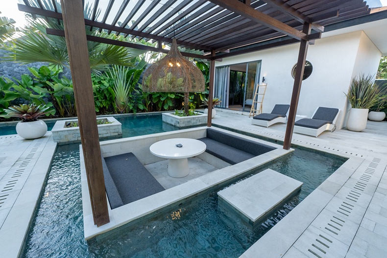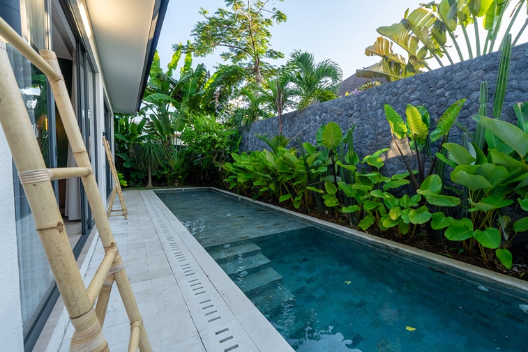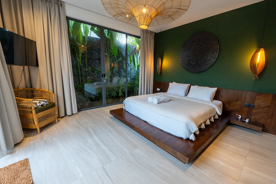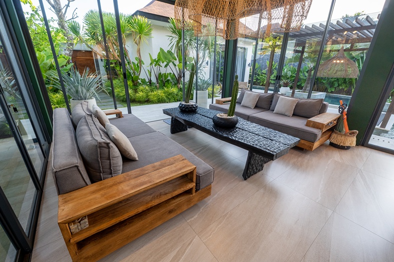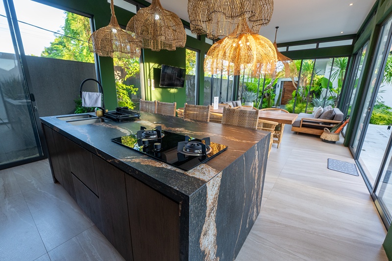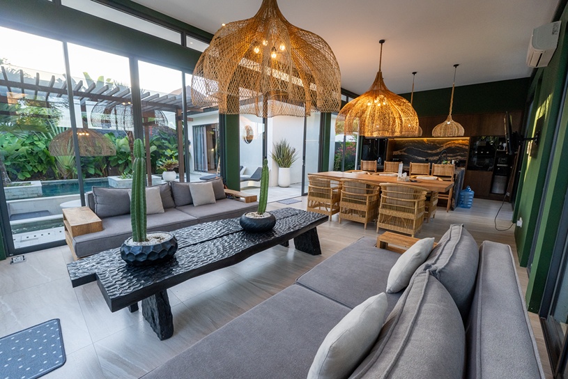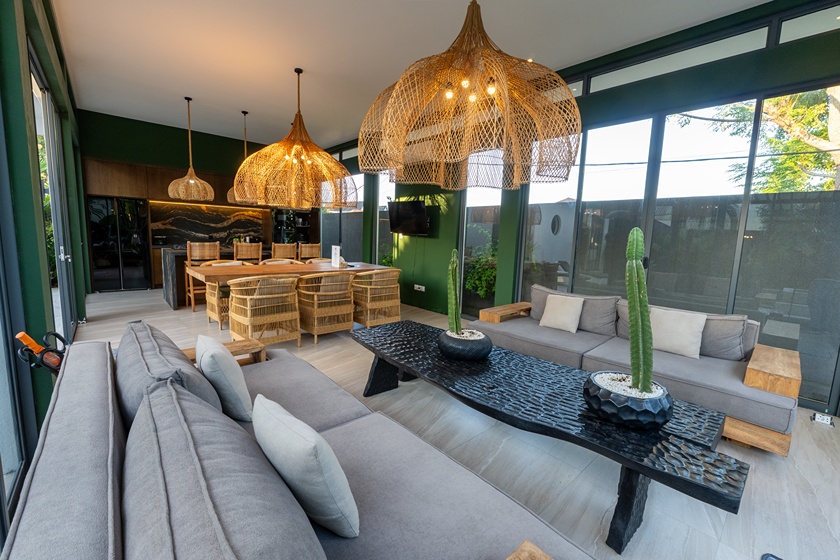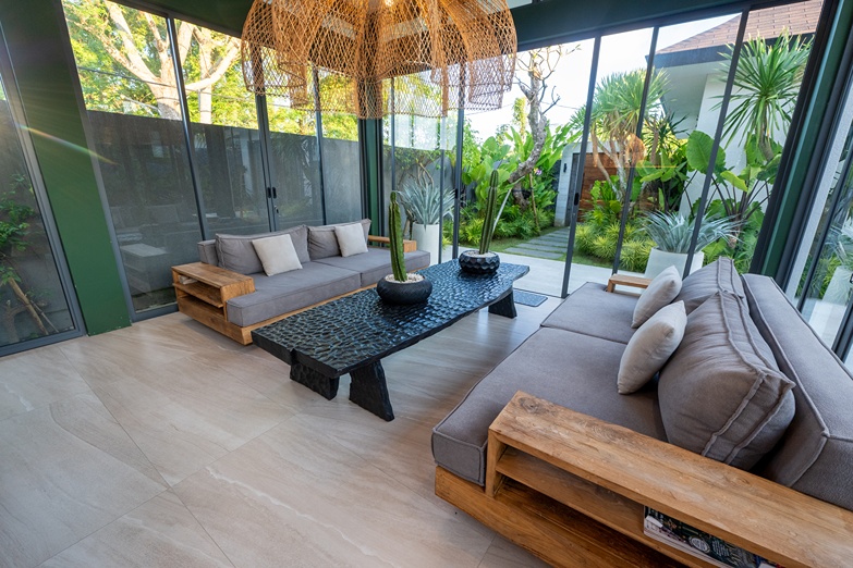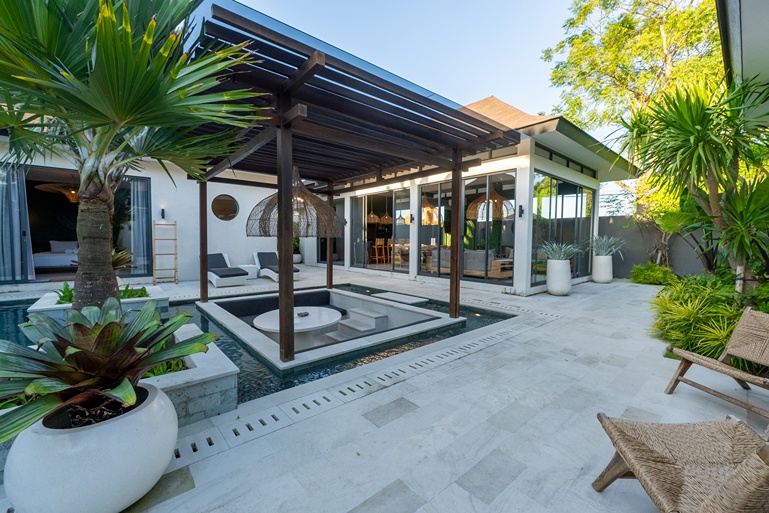 This elegant single-floor villa features three spacious bedrooms, each with its own bathroom, plus an additional guest bathroom for convenience. The open-concept living room and kitchen create a seamless indoor-outdoor flow, leading to a private pool with a stylish sunken lounge—perfect for relaxation and entertaining in a serene tropical setting.