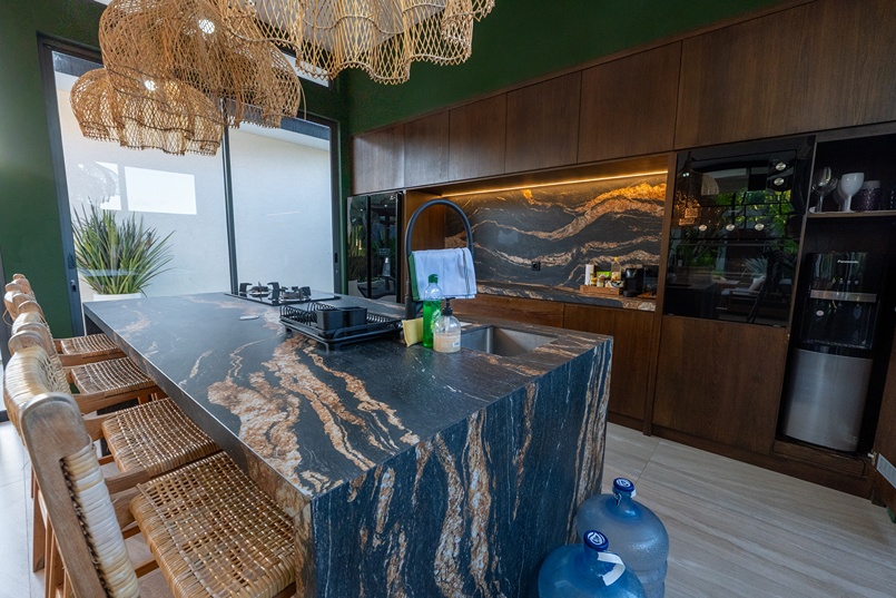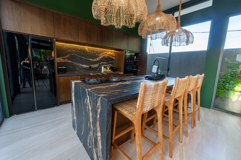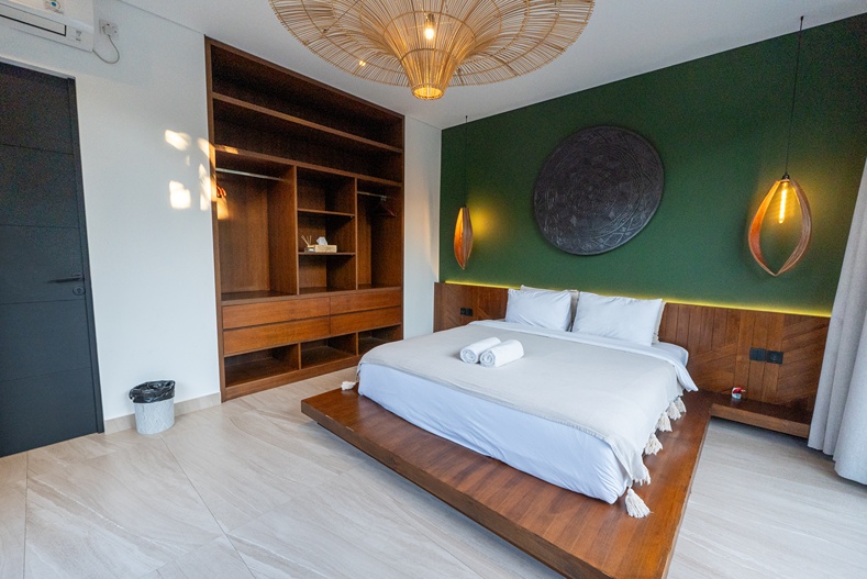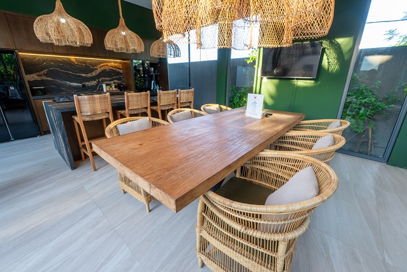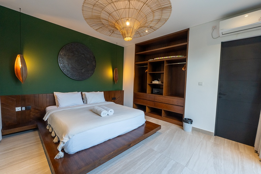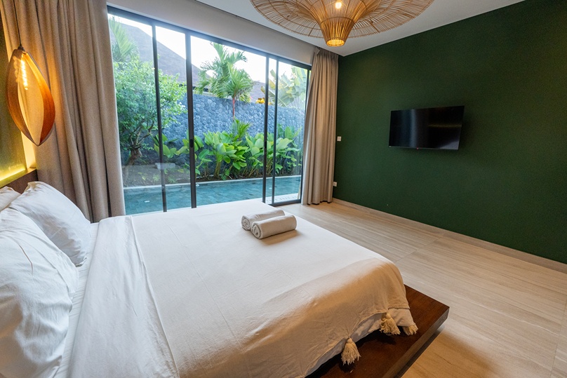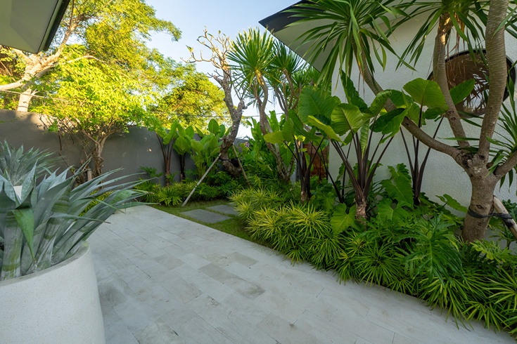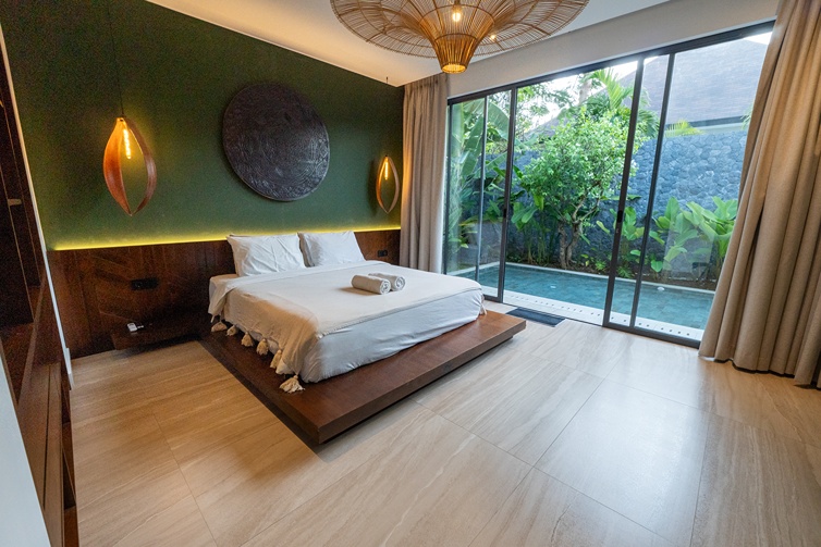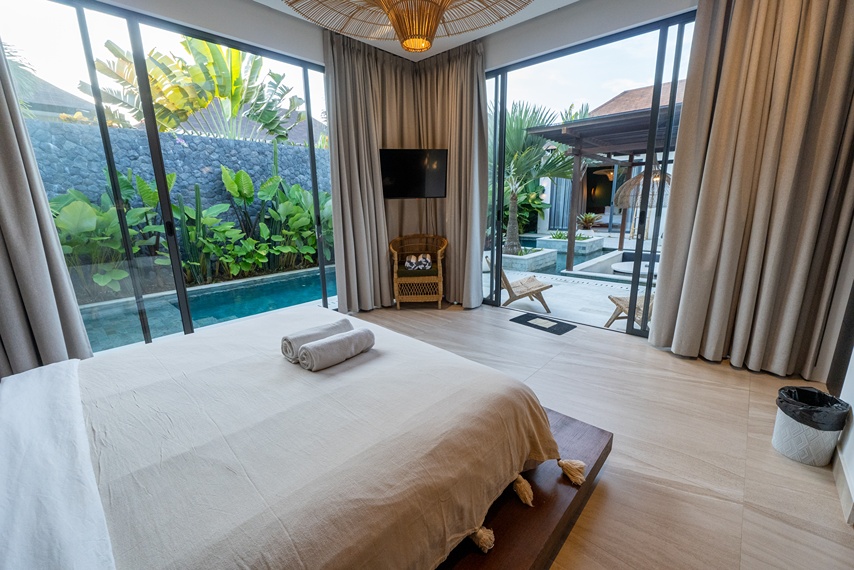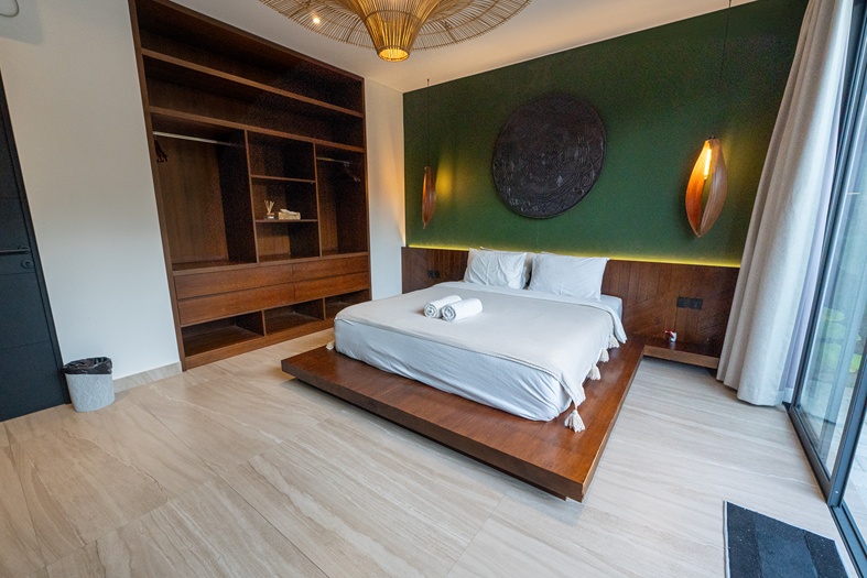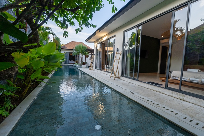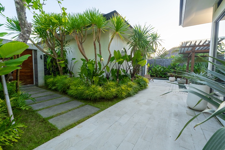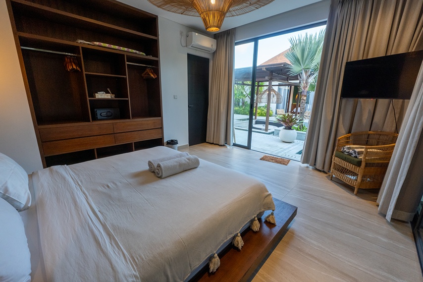 This elegant single-floor villa features three spacious bedrooms, each with its own bathroom, plus an additional guest bathroom for convenience. The open-concept living room and kitchen create a seamless indoor-outdoor flow, leading to a private pool with a stylish sunken lounge—perfect for relaxation and entertaining in a serene tropical setting.