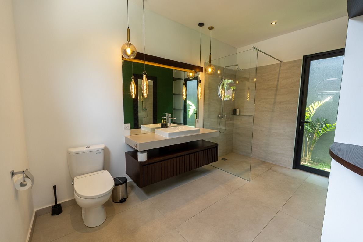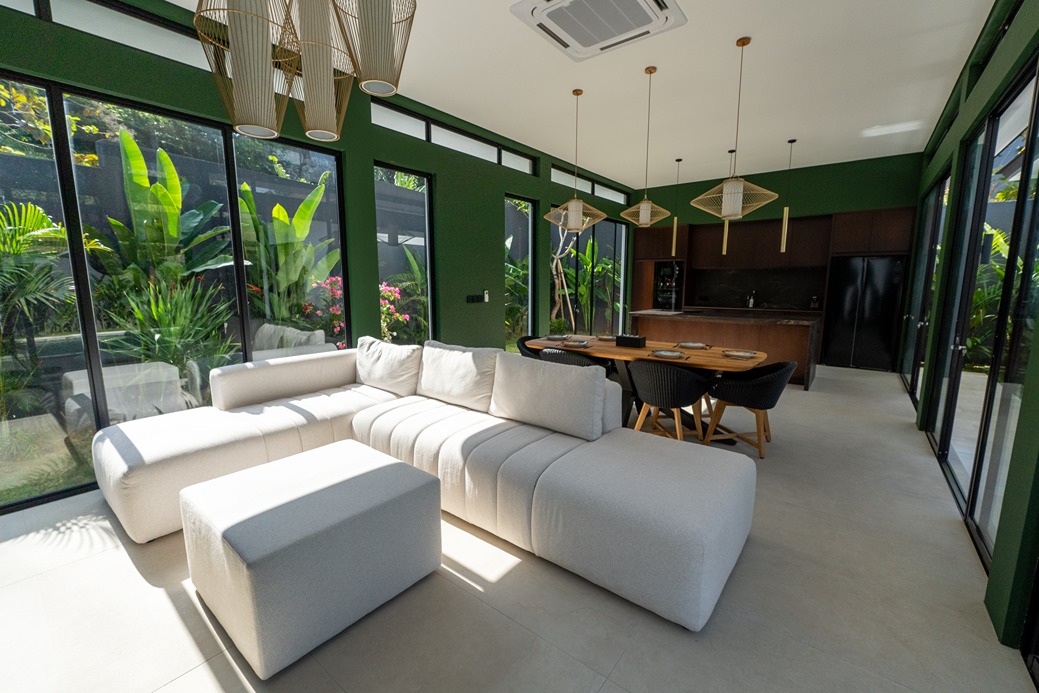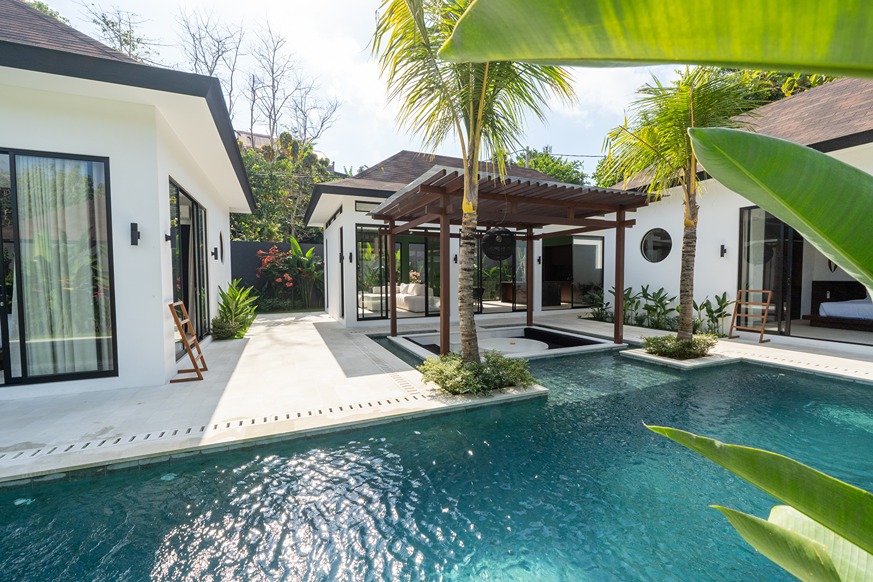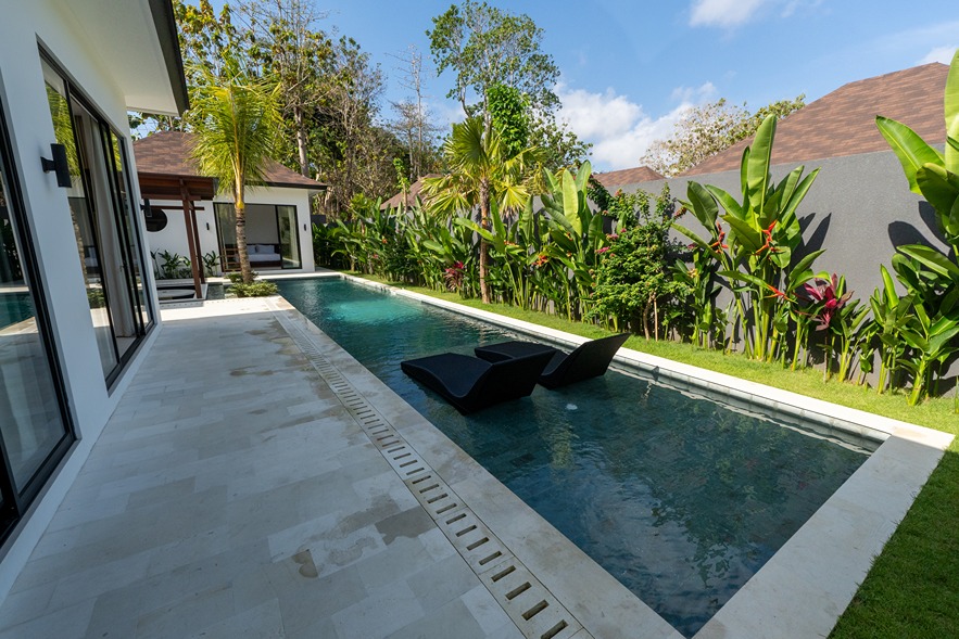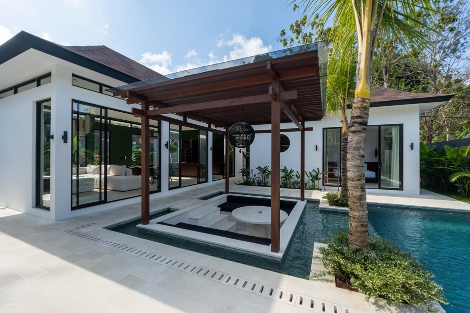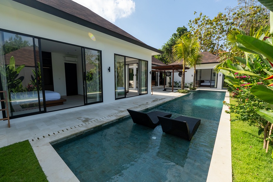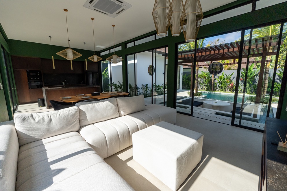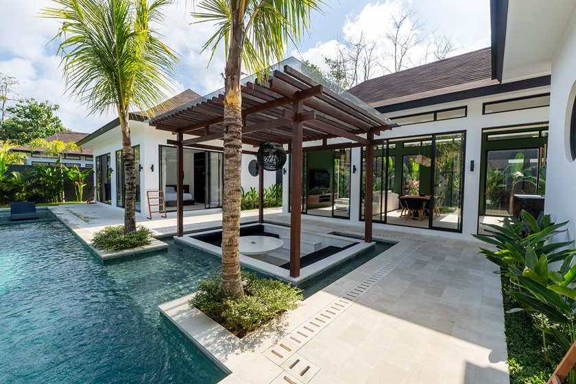 This single-story 3-bedroom villa offers privacy and comfort, with each bedroom featuring its own ensuite bathroom. The bright, naturally lit living room and the bedrooms are thoughtfully separated for a peaceful layout. The kitchen comes equipped with a washing machine for added convenience. Outside, enjoy a private pool with a sunken lounge, plus a wash and storage room. A perfect blend of functional design and tropical charm.