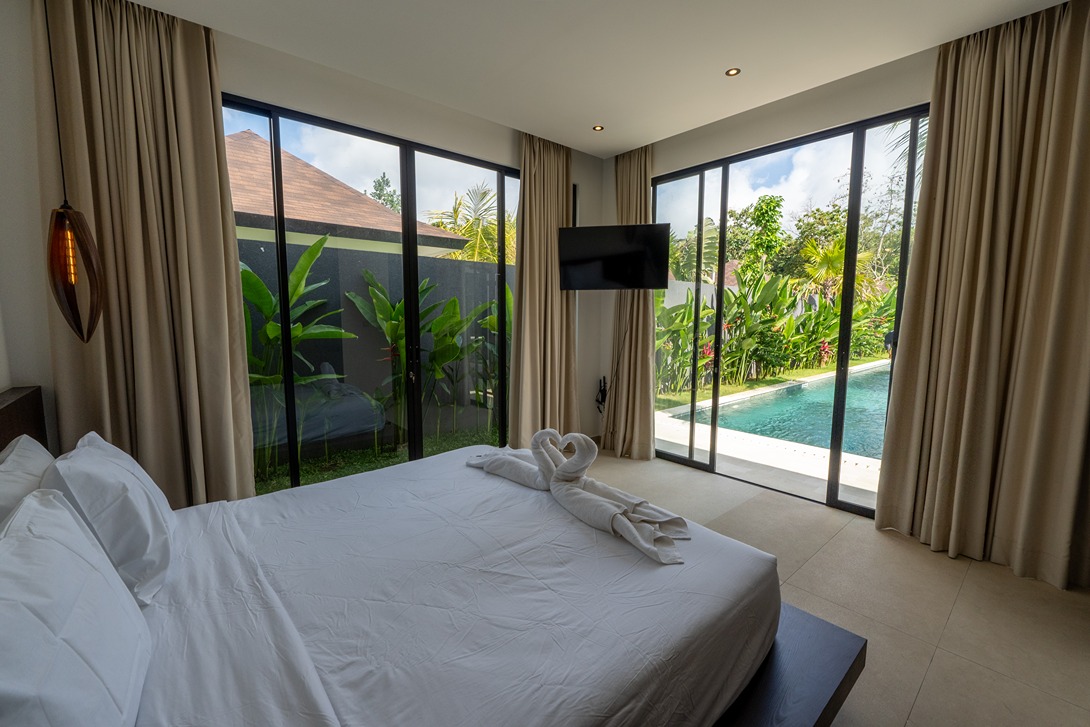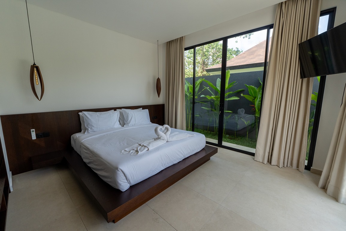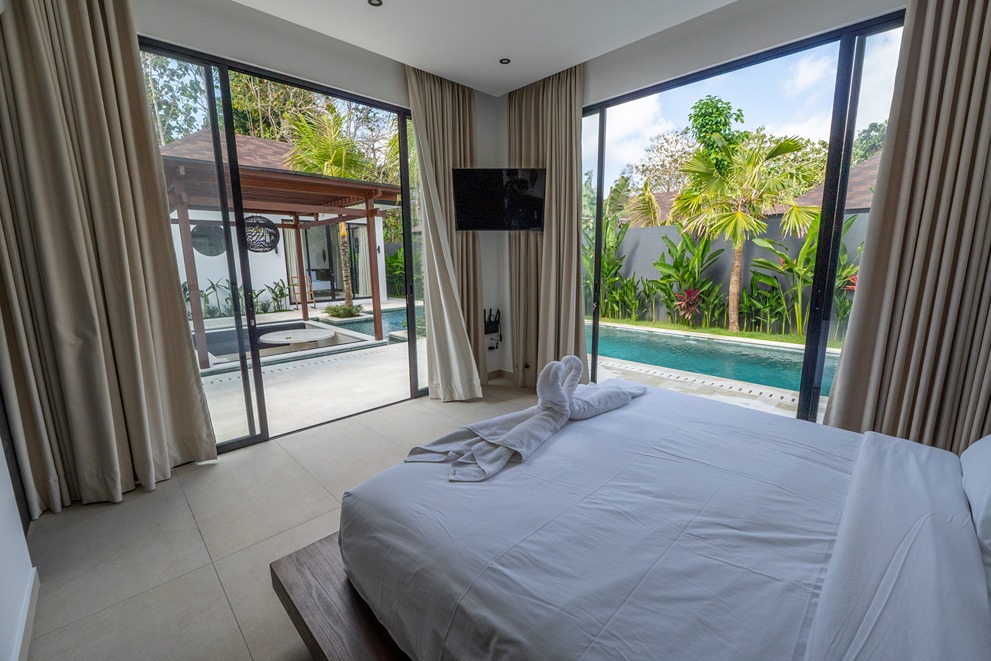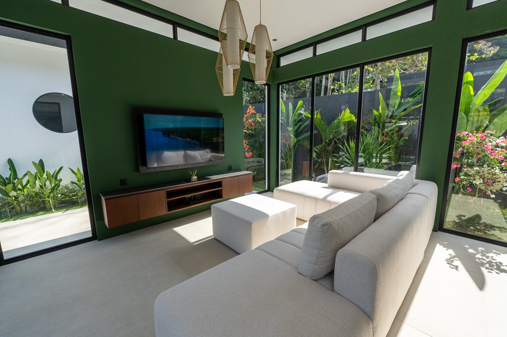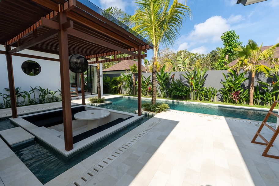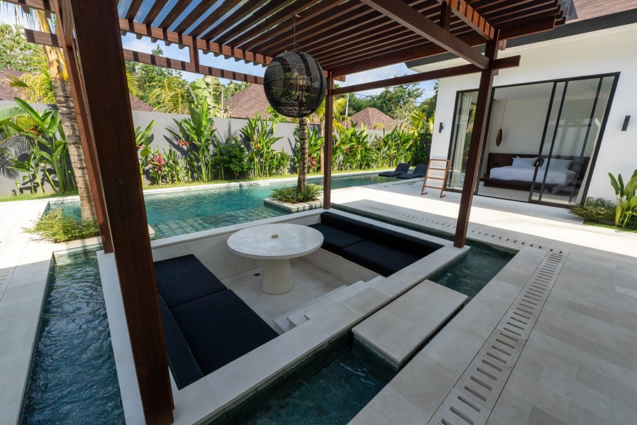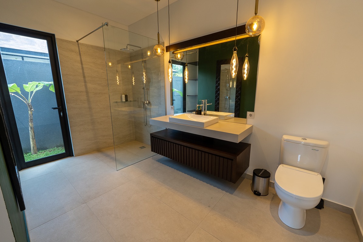 This single-story 3-bedroom villa offers privacy and comfort, with each bedroom featuring its own ensuite bathroom. The bright, naturally lit living room and the bedrooms are thoughtfully separated for a peaceful layout. The kitchen comes equipped with a washing machine for added convenience. Outside, enjoy a private pool with a sunken lounge, plus a wash and storage room. A perfect blend of functional design and tropical charm.