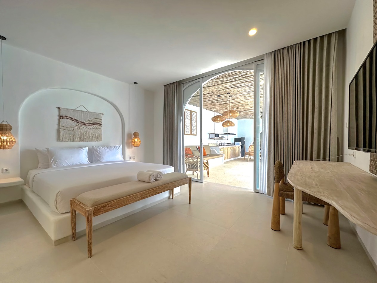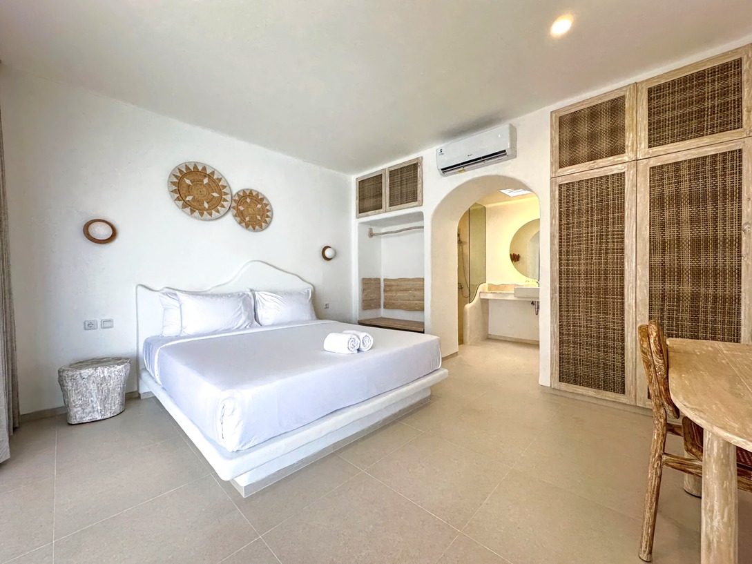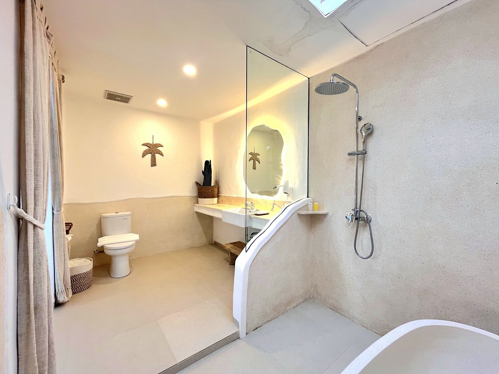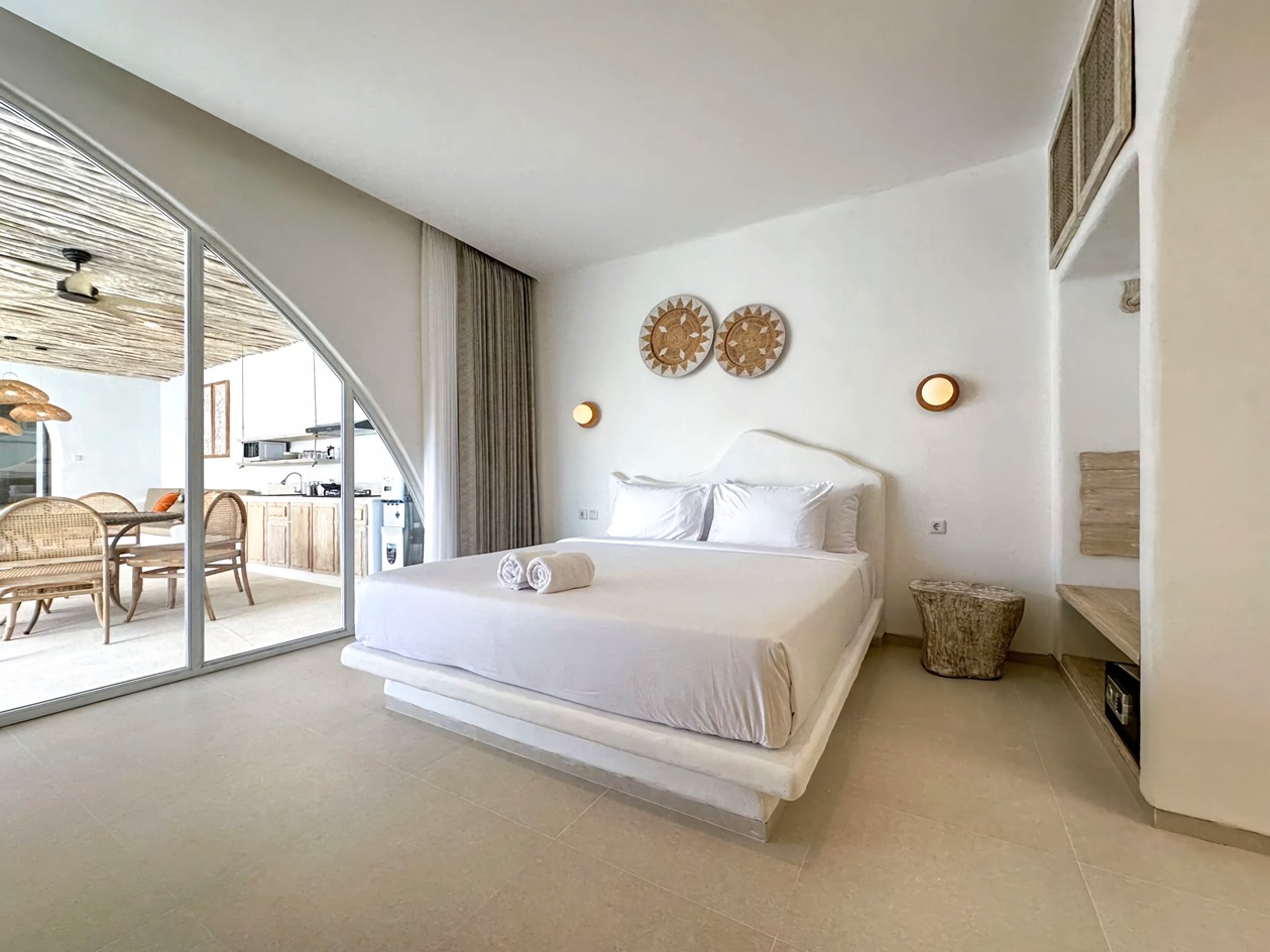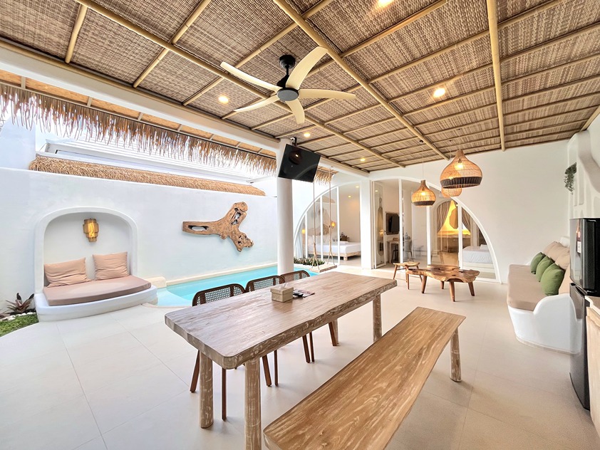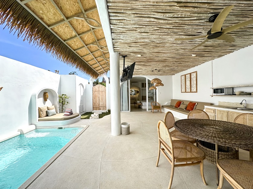 This charming single-story Mediterranean-style villa features 2 bedrooms, a private pool, and a spacious open living room and kitchen—perfect for relaxed tropical living. Designed with neutral tones and organic shapes, the villa exudes warmth and softness, creating a calming, airy atmosphere throughout.