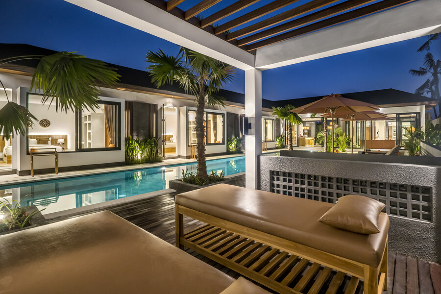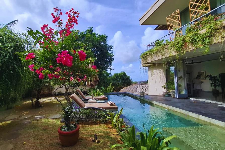 - Large pool with sun loungers and an outdoor conversation pit by the pool