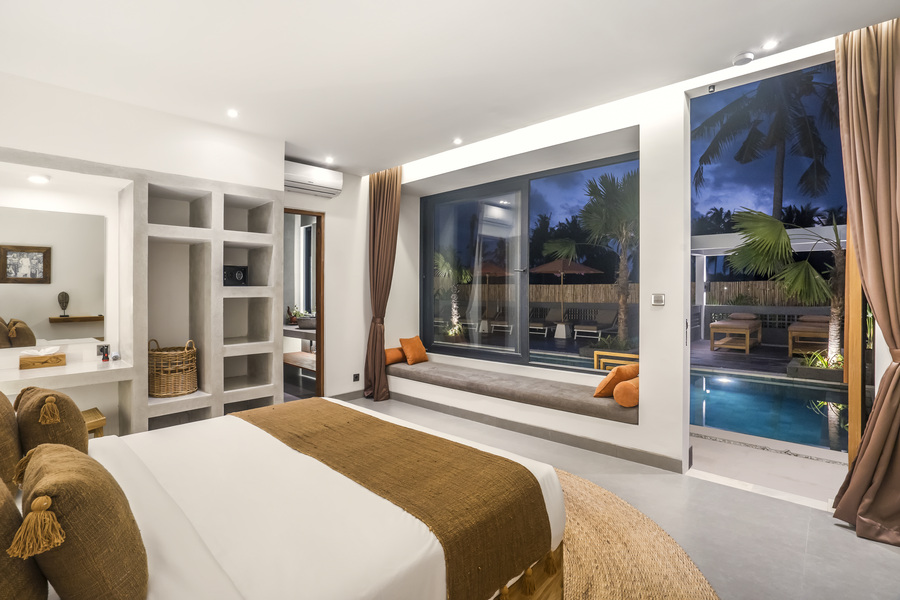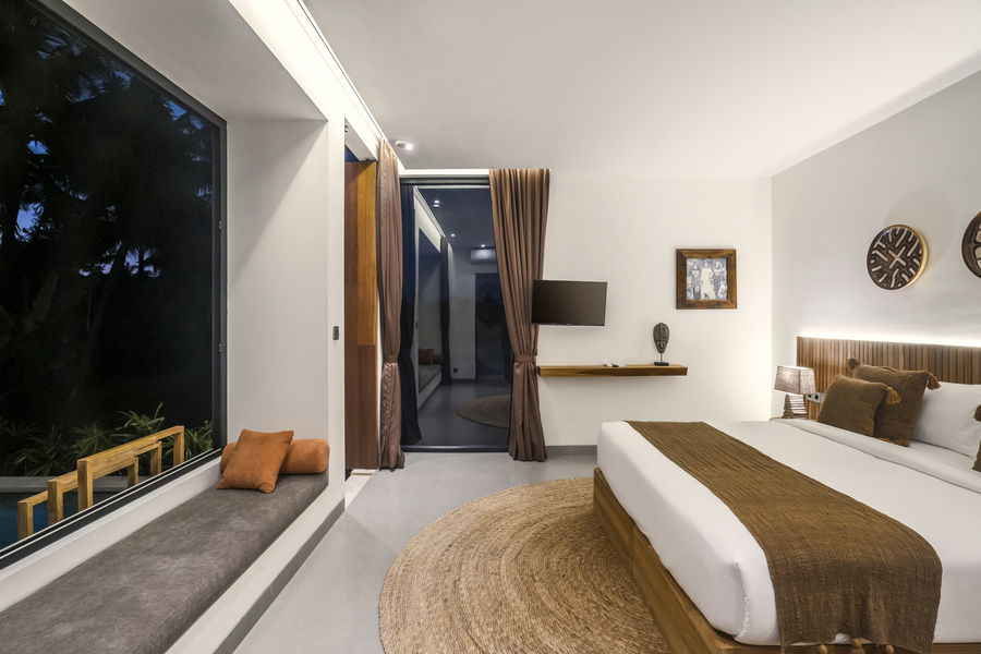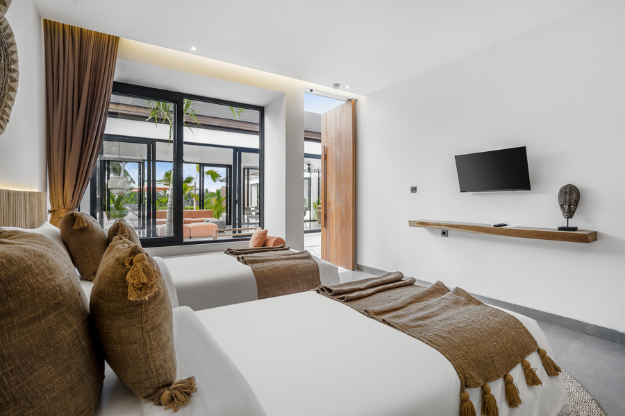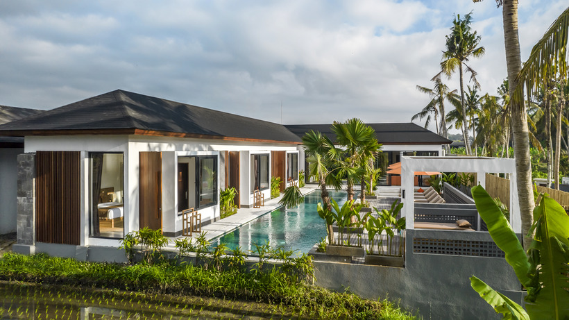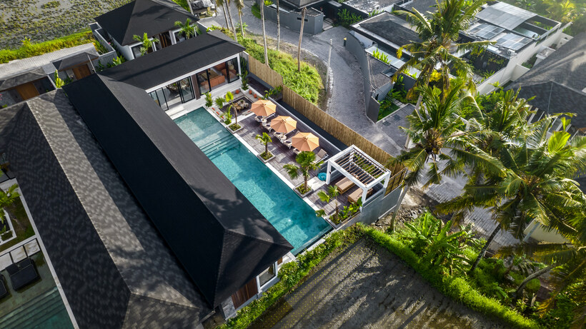 A luxurious single-floor 5-bedroom villa set amidst Ubud’s tranquil rice fields. The villa features elegant open-plan living, spacious bedrooms with lush views, and a sparkling private pool surrounded by tropical landscaping. A serene retreat blending modern comfort with Ubud’s natural charm.