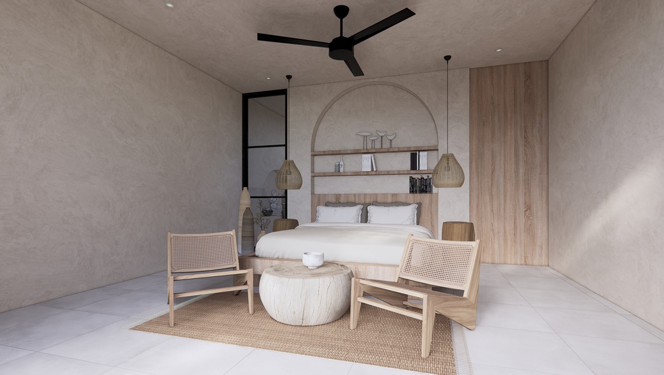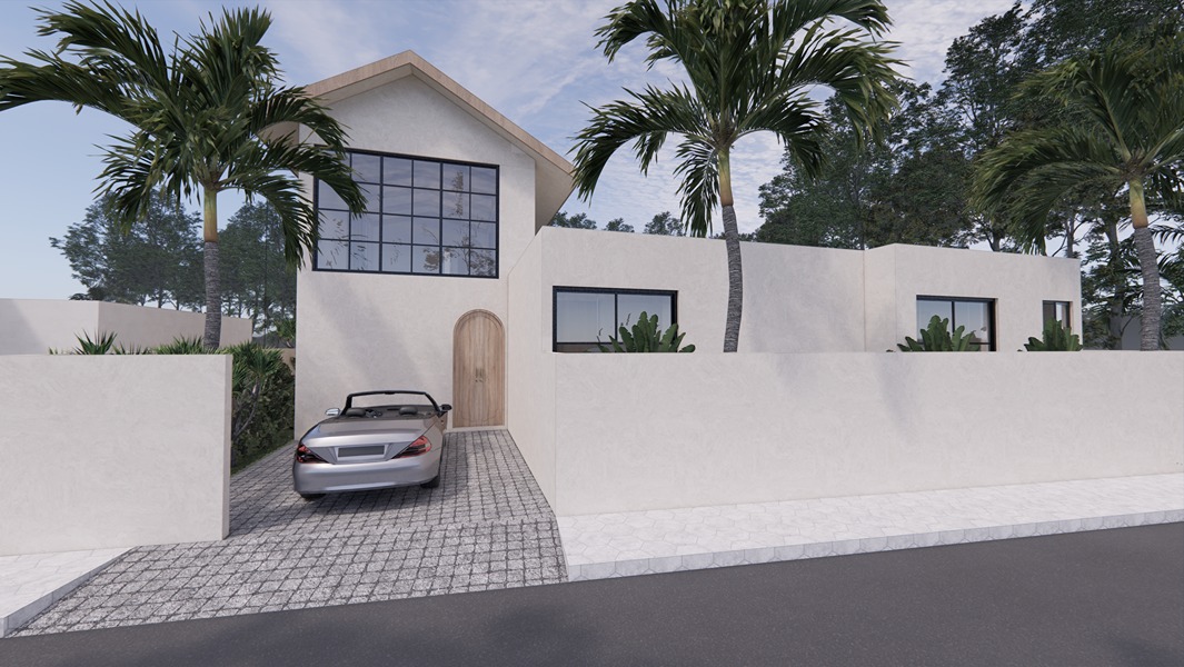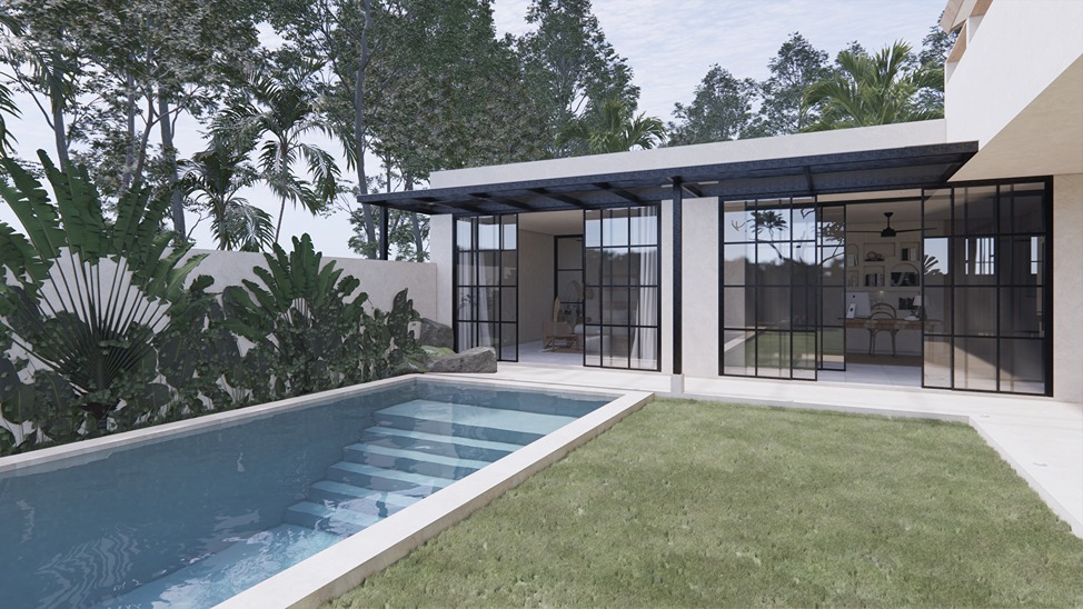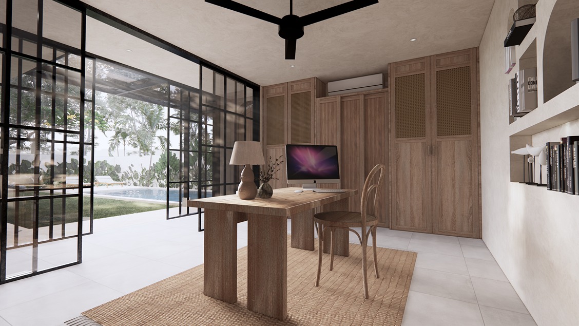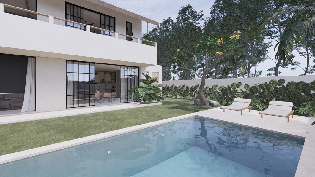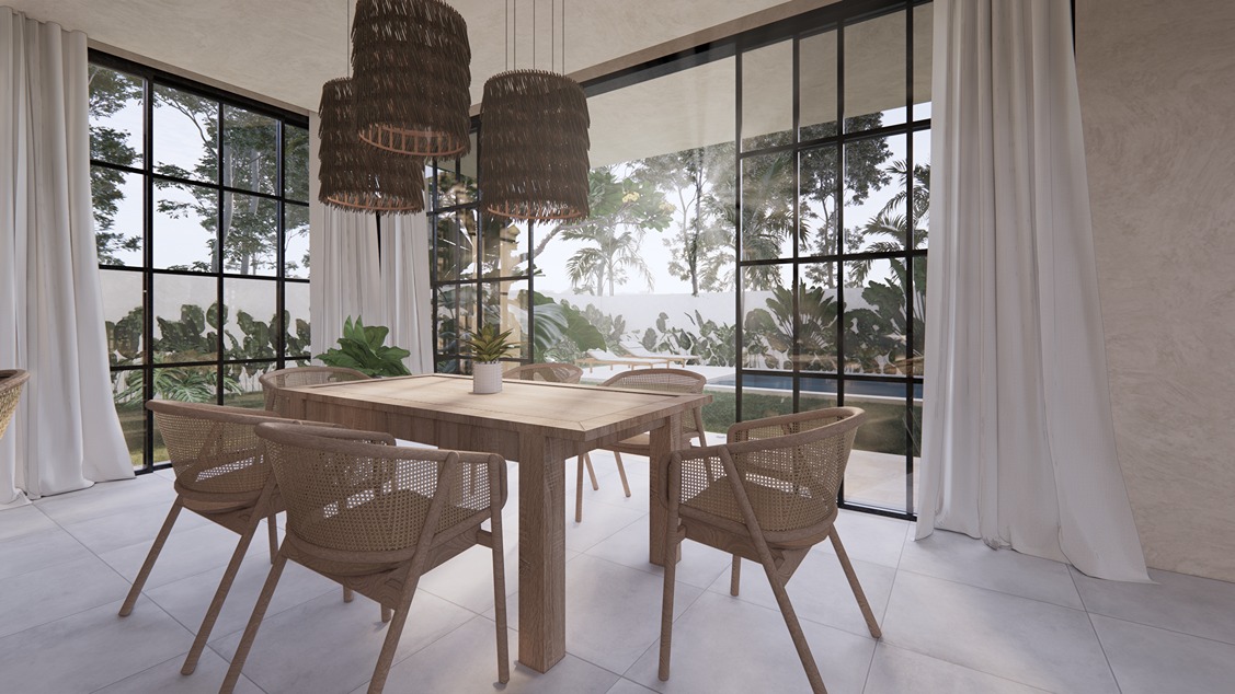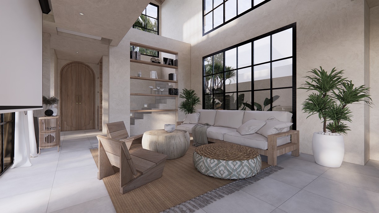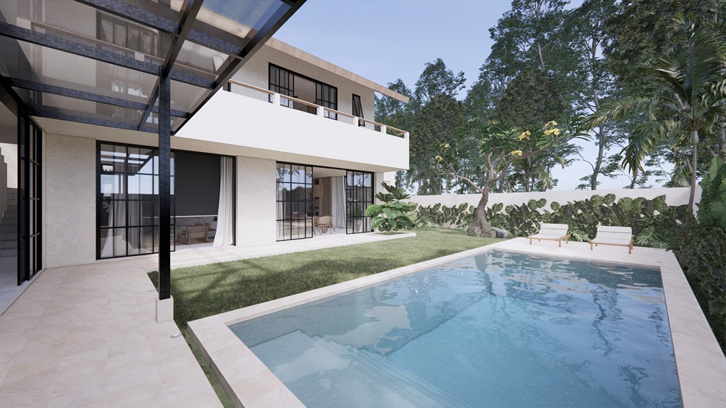 This stunning 3-bedroom villa in Balangan showcases a sleek modern design with natural tones and elegant finishes. Built on two floors in an L-shape around a private pool, the layout creates a seamless indoor-outdoor flow filled with natural light. The spacious living area, open kitchen, and dining space feature warm wood textures, smooth surfaces, and large glass panels that frame the tropical surroundings—offering a perfect balance of comfort and contemporary style.