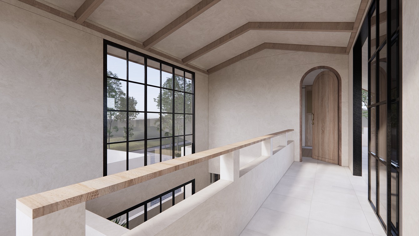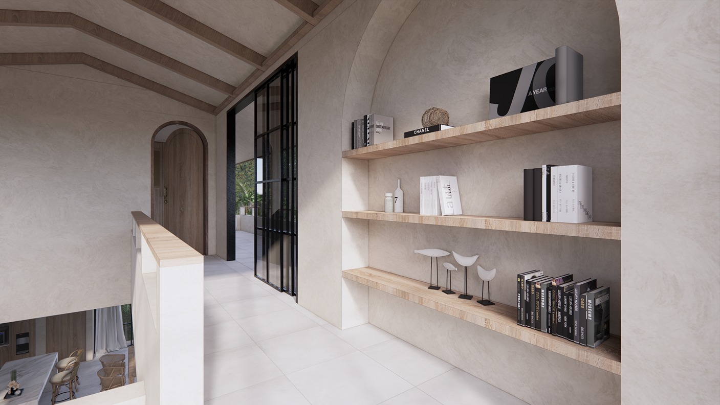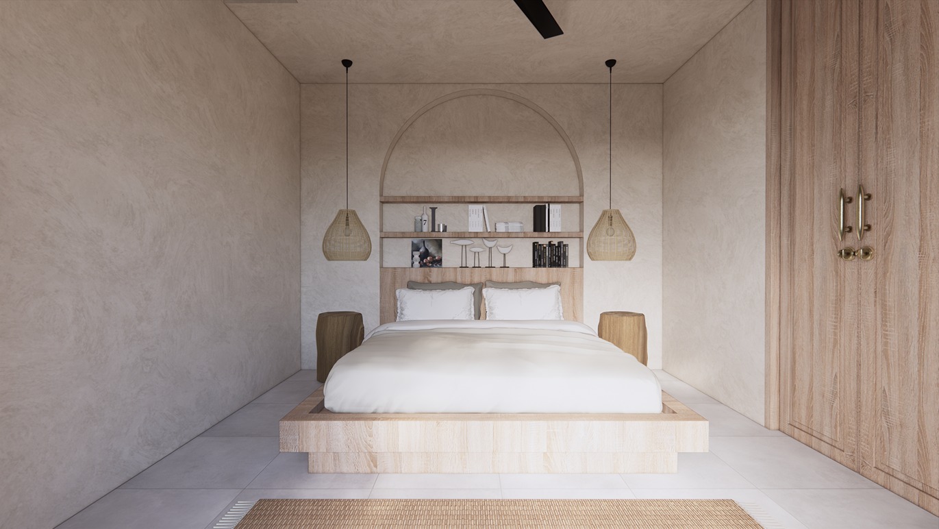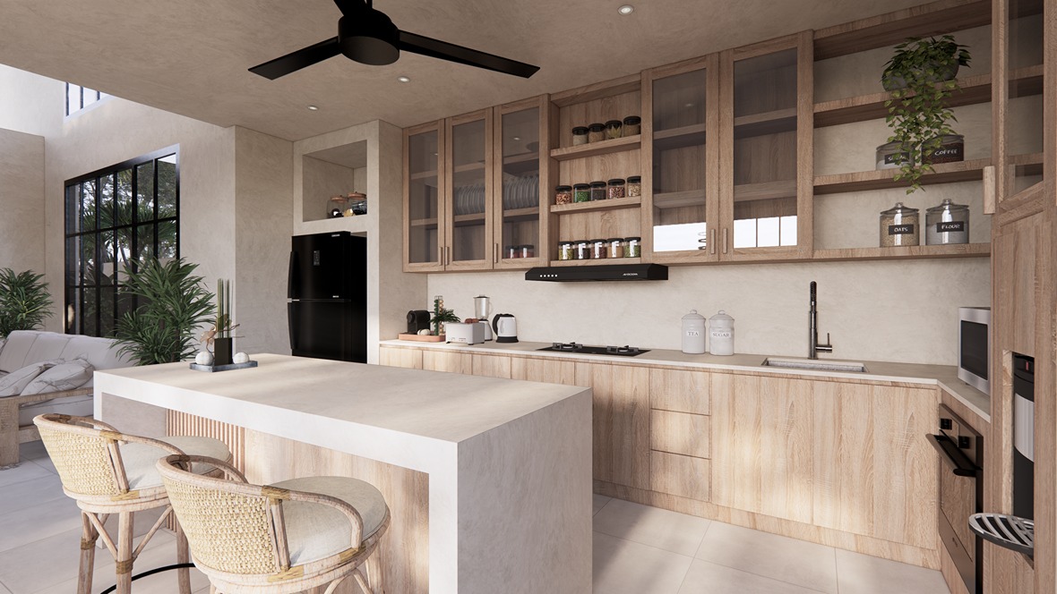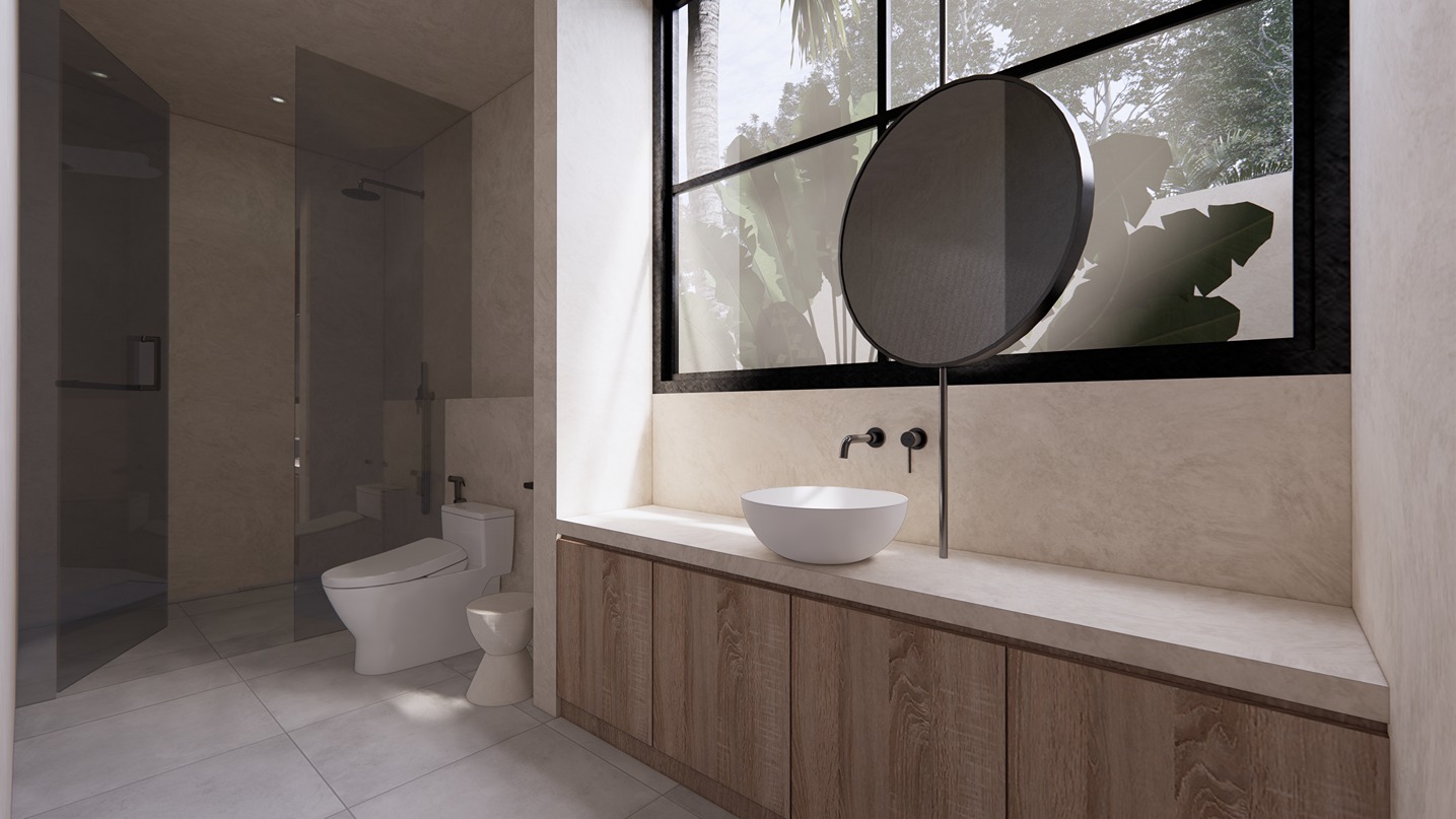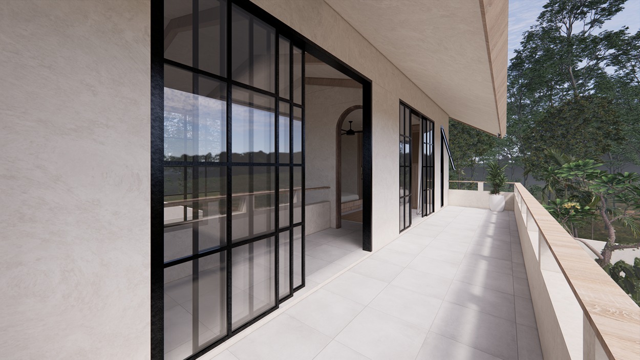 This stunning 3-bedroom villa in Balangan showcases a sleek modern design with natural tones and elegant finishes. Built on two floors in an L-shape around a private pool, the layout creates a seamless indoor-outdoor flow filled with natural light. The spacious living area, open kitchen, and dining space feature warm wood textures, smooth surfaces, and large glass panels that frame the tropical surroundings—offering a perfect balance of comfort and contemporary style.