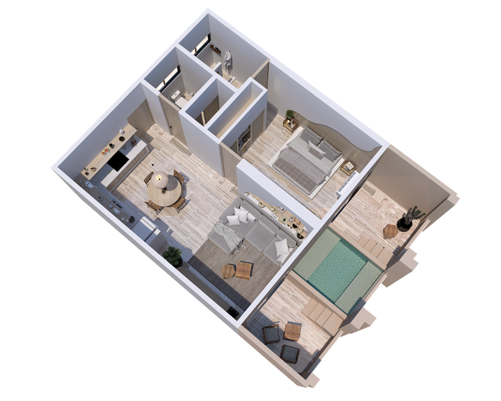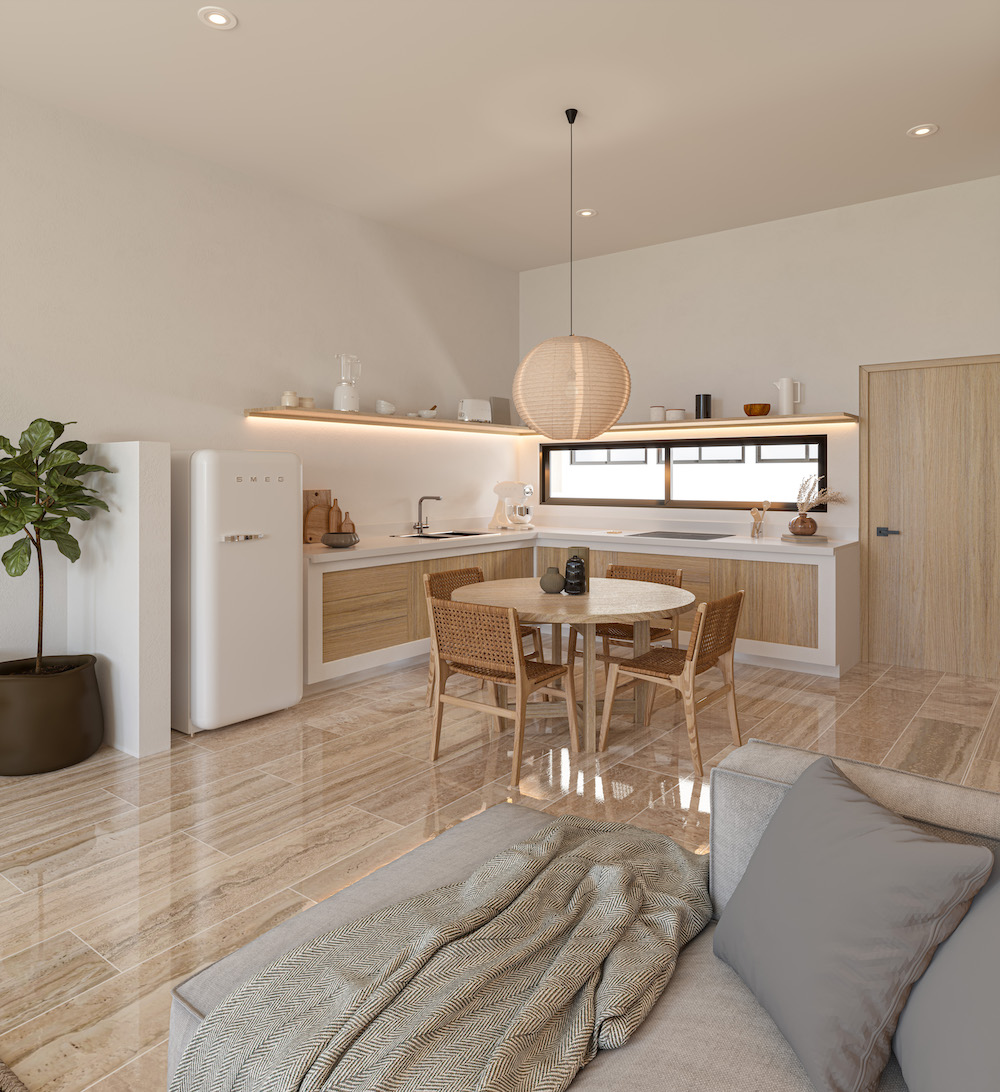 The apartment is located in a new residence in Tulum, Mexico, in the Aldea. Zama district. Right next to the town center and shops, you're just 6 minutes from the beach, 15 minutes from Tulum's historic ruins and 45 minutes from the international airport.