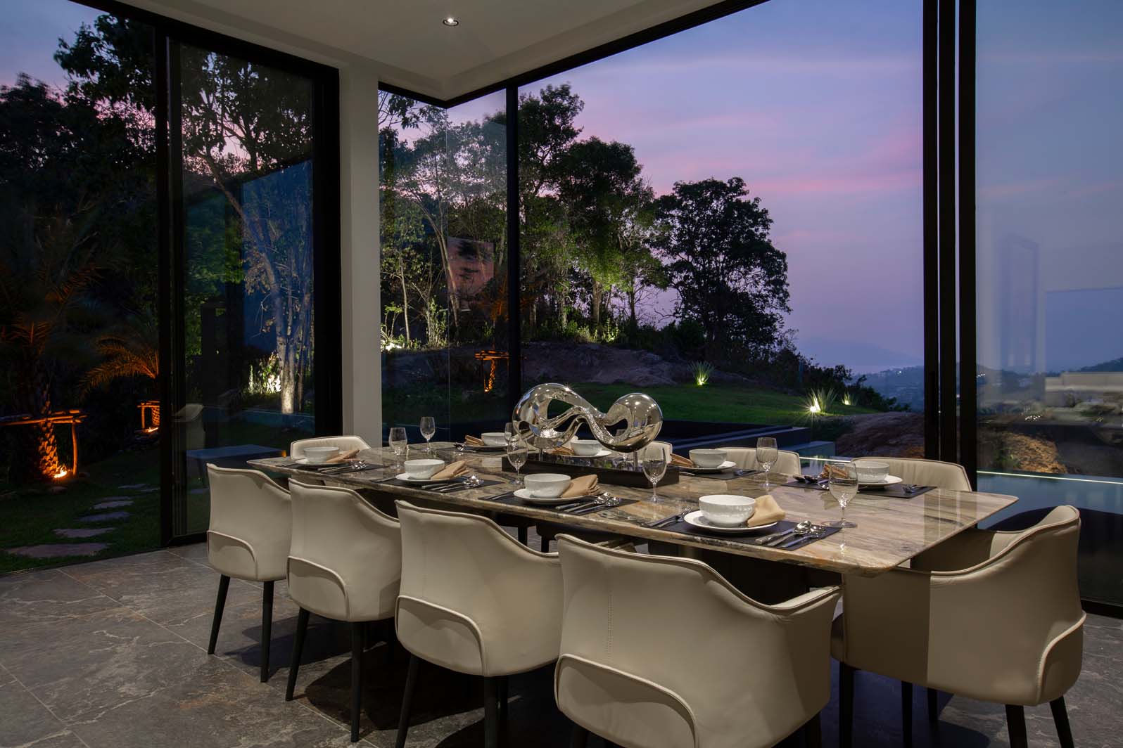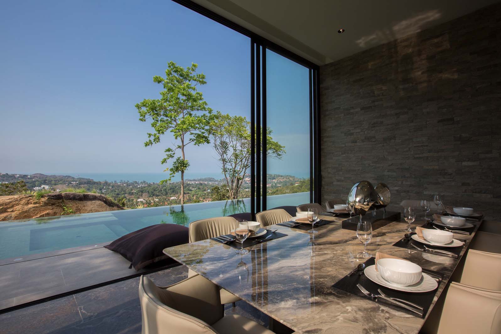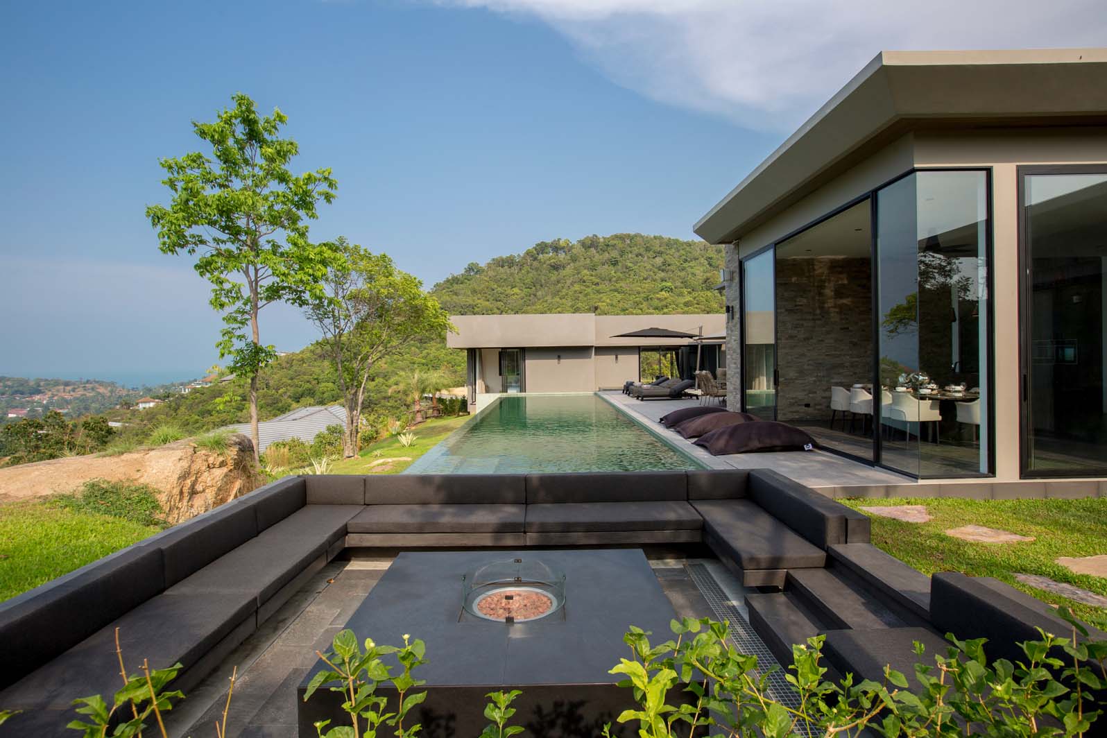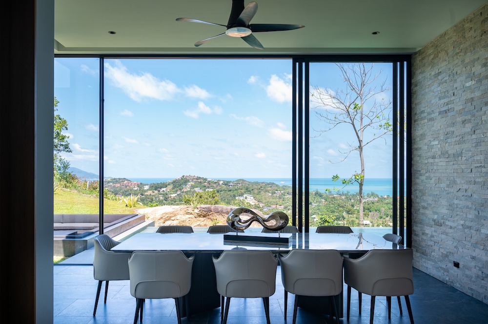 Step outside to discover the epitome of tropical indulgence—an expansive terrace with a built-in barbecue, plush bean bags, and inviting loungers surrounding a 20-meter infinity saltwater pool. Relax in the sala with a gas fire pit, or dine al fresco at the imperial table for 10, all while marveling at the awe-inspiring views of Koh Samui.