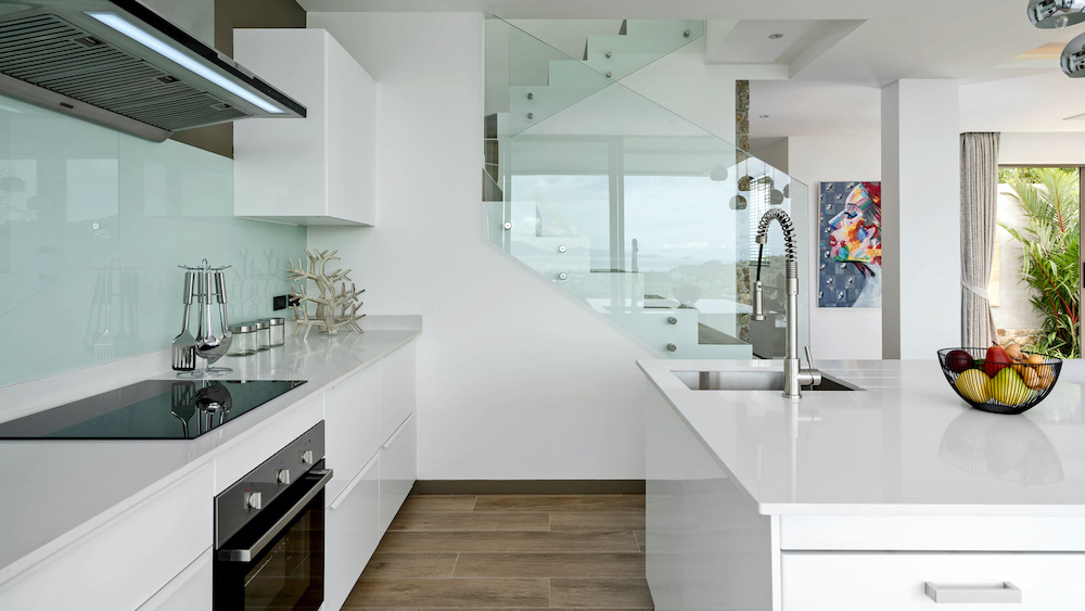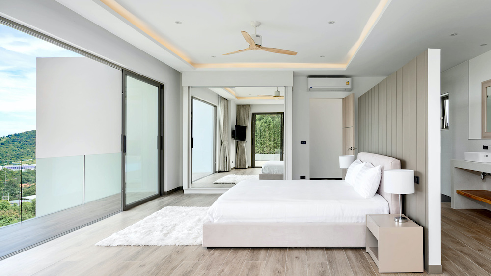 The other two bedrooms are located on the upper level with modern bathrooms and large balconies with sea views. A guest bedroom is located outside the villa.