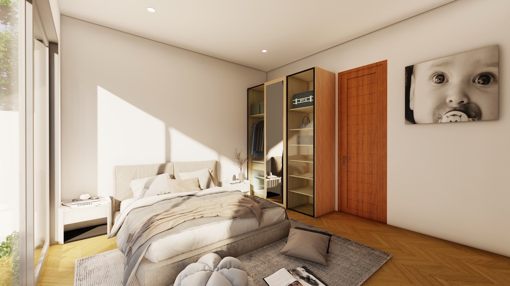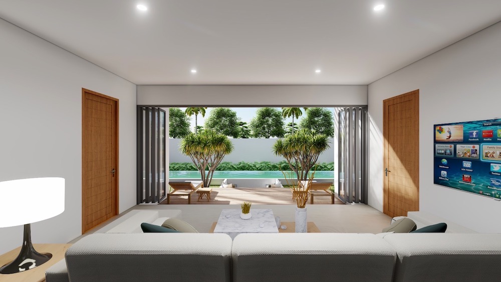 The villa features large bay windows opening onto the pool, and the spacious interiors are decorated with traditional Balinese elements, creating an atmosphere of serenity and luxury. The villa also features a living room that opens onto the terrace and benefits from natural light.