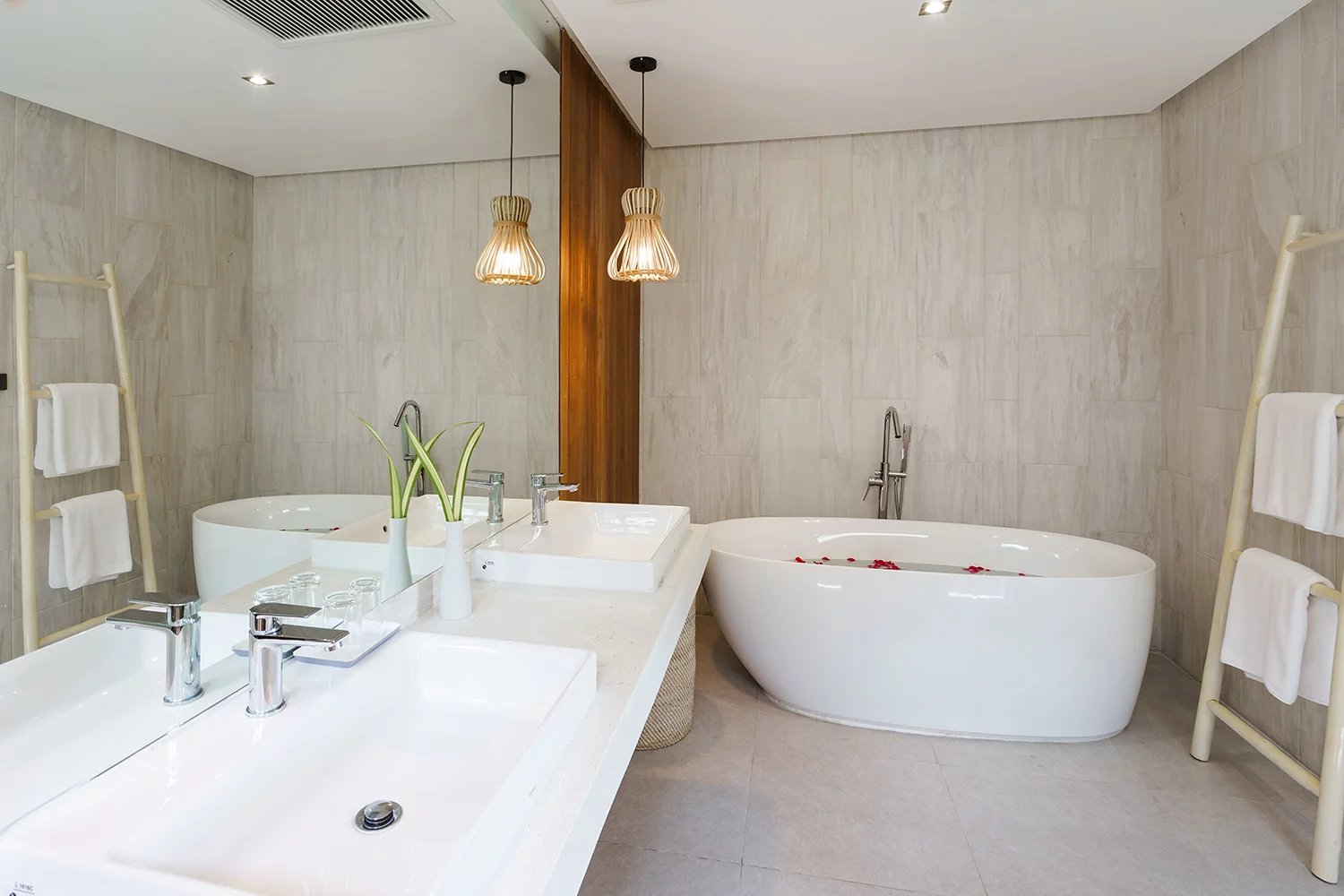 These beachfront villas are located in the south of the island - Baan Talay Beach (between Laemset and Bang Kao Beach), this location is easily accessible as it is close to Hua Thanon. The two villas are located side by side and are both for sale. The villas are finished to the highest standards, featuring imported Turkish travertine, stone, Indian slate and European engineered wood throughout.