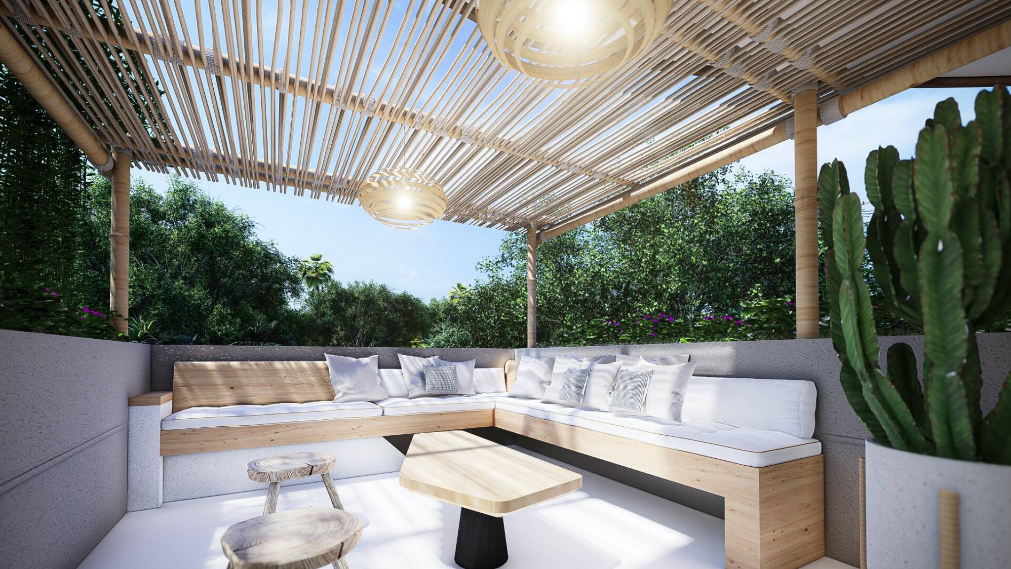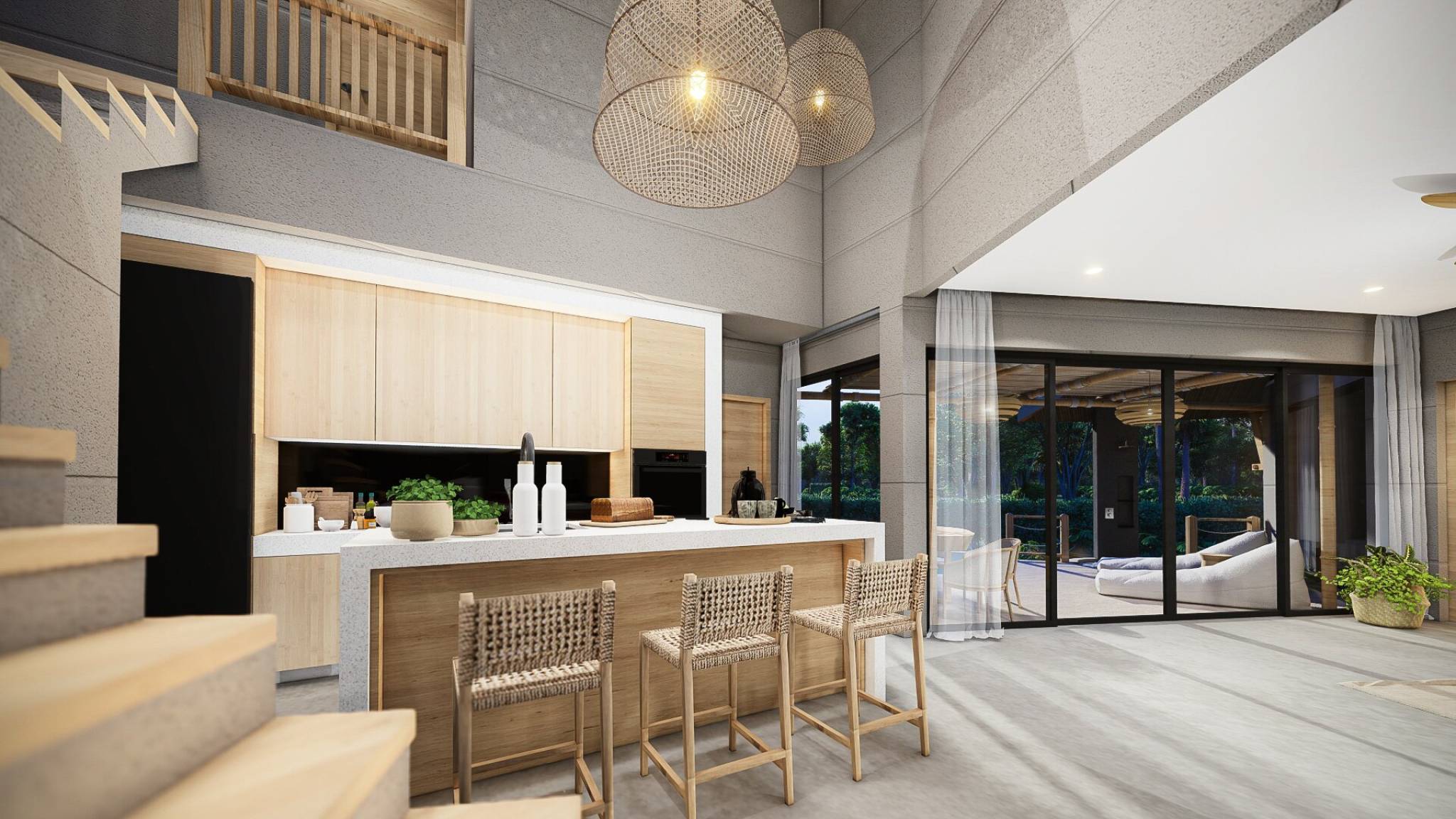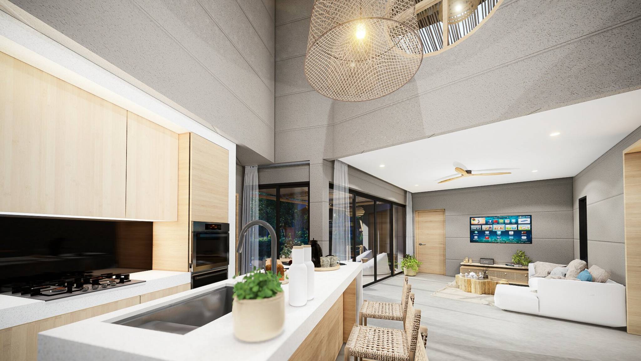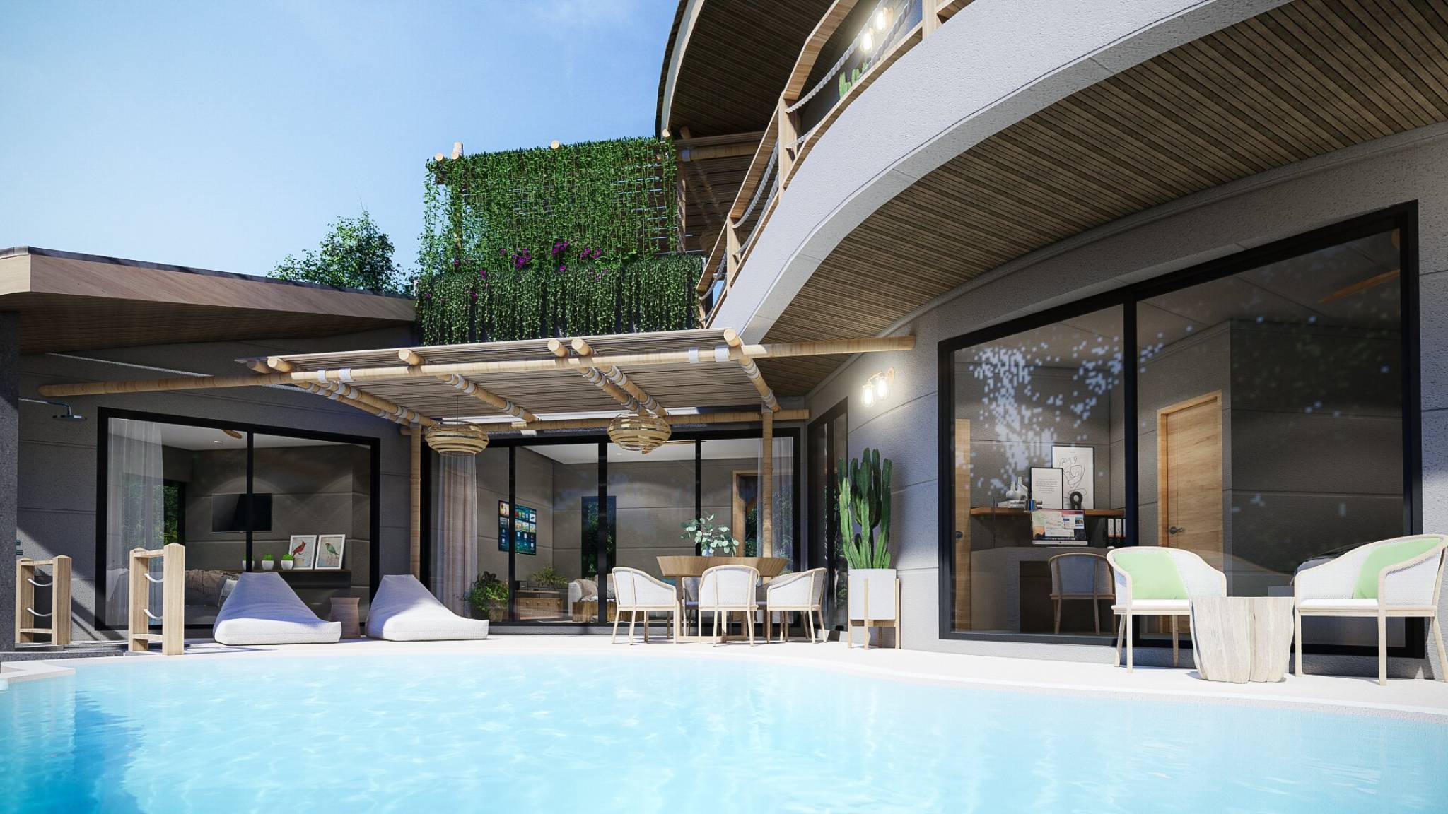 The villa adopts an open concept, enhanced by floor-to-ceiling glass doors that invite in an abundance of natural light, creating a seamless indoor-outdoor living experience. Outside, the multi-level design unfolds into a lush oasis, complete with private pool. Entertain guests in the alfresco dining room or relax under the pergola, while enjoying the serene ambience created by ambient lighting and water features.