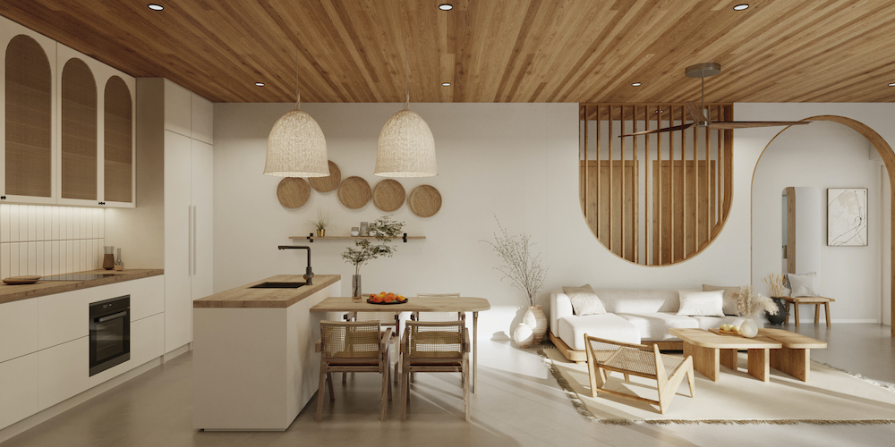 Espace de Vie et Cuisine : Un agencement ouvert mettant en valeur une cuisine moderne, aux lignes épurées et aux finitions sophistiquées, créant une atmosphère accueillante et fonctionnelle.